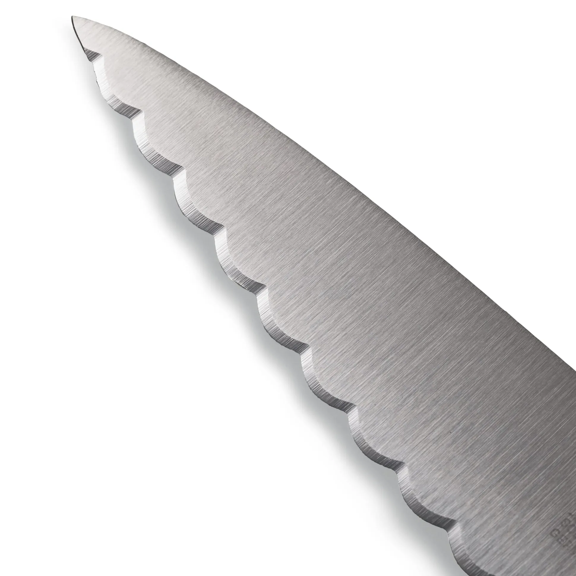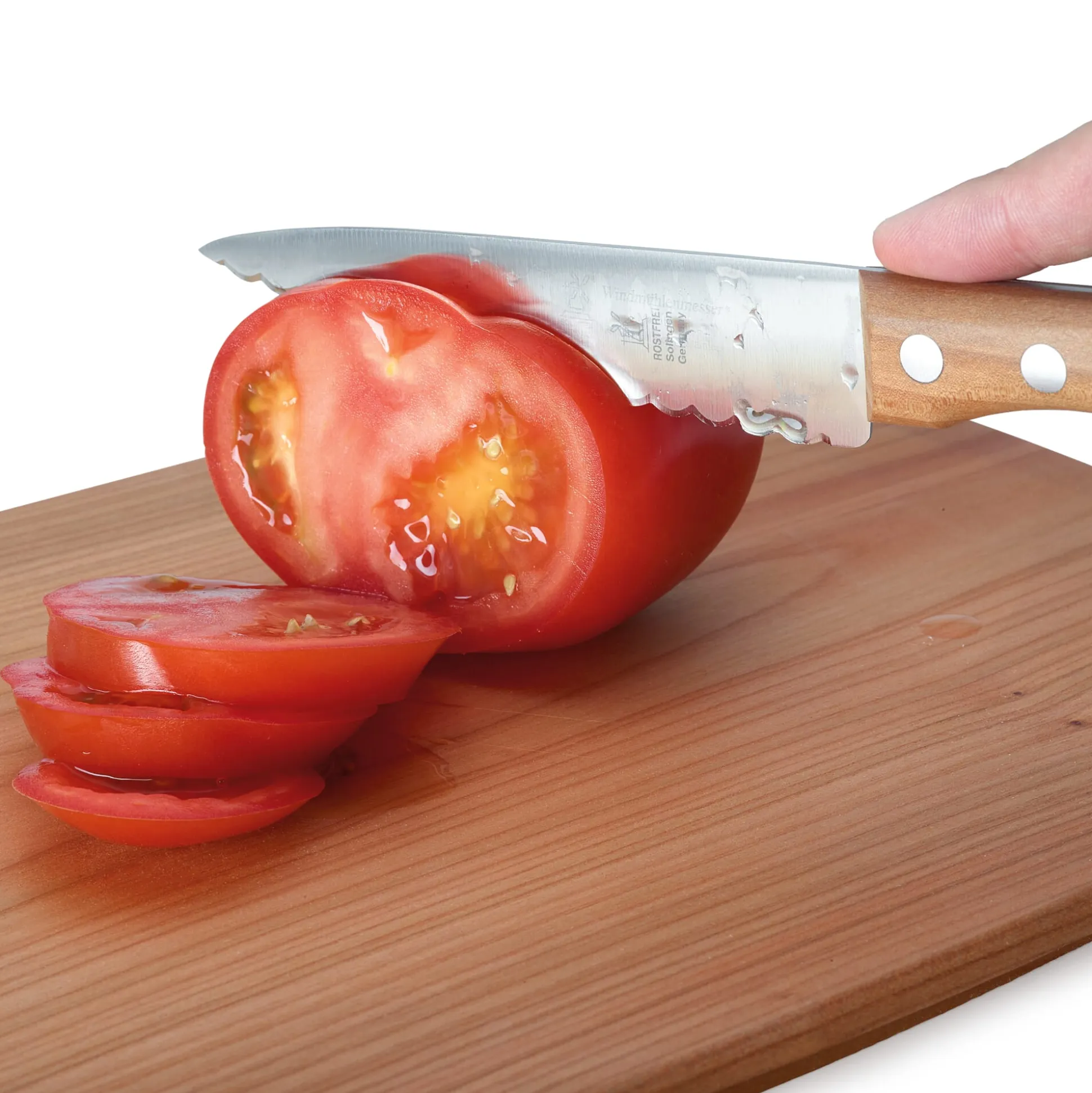 Die Spezialität dieses Wellenschliffmessers mit konvexem Schliff ist das Schneiden von Tomaten, Paprika und allen Gemüsen, die innen weich, aber außen durch eine widerstandsfähige, feste Haut geschützt sind. Mit nur einem gezogenen Schnitt durchteilt man sie mühelos, ohne dass Fruchtfleisch zerdrückt oder gequetscht wird und damit verloren geht. Beim konvexen Schliff beult die Welle sich nach außen – üblich ist bei den meisten Wellenschliffmessern der einfachere konkave Schliff mit nach innen gebeulter Welle. Das Universalmesser kommt aus der Windmühlenmesser-Manufactur Herder in Solingen. Die beidseitig geschliffene Klinge ist aus rostfreiem Stahl, die Messergriffe sind eigens für Manufactum aus gedämpftem, fein und glatt poliertem Apfelholz gearbeitet.