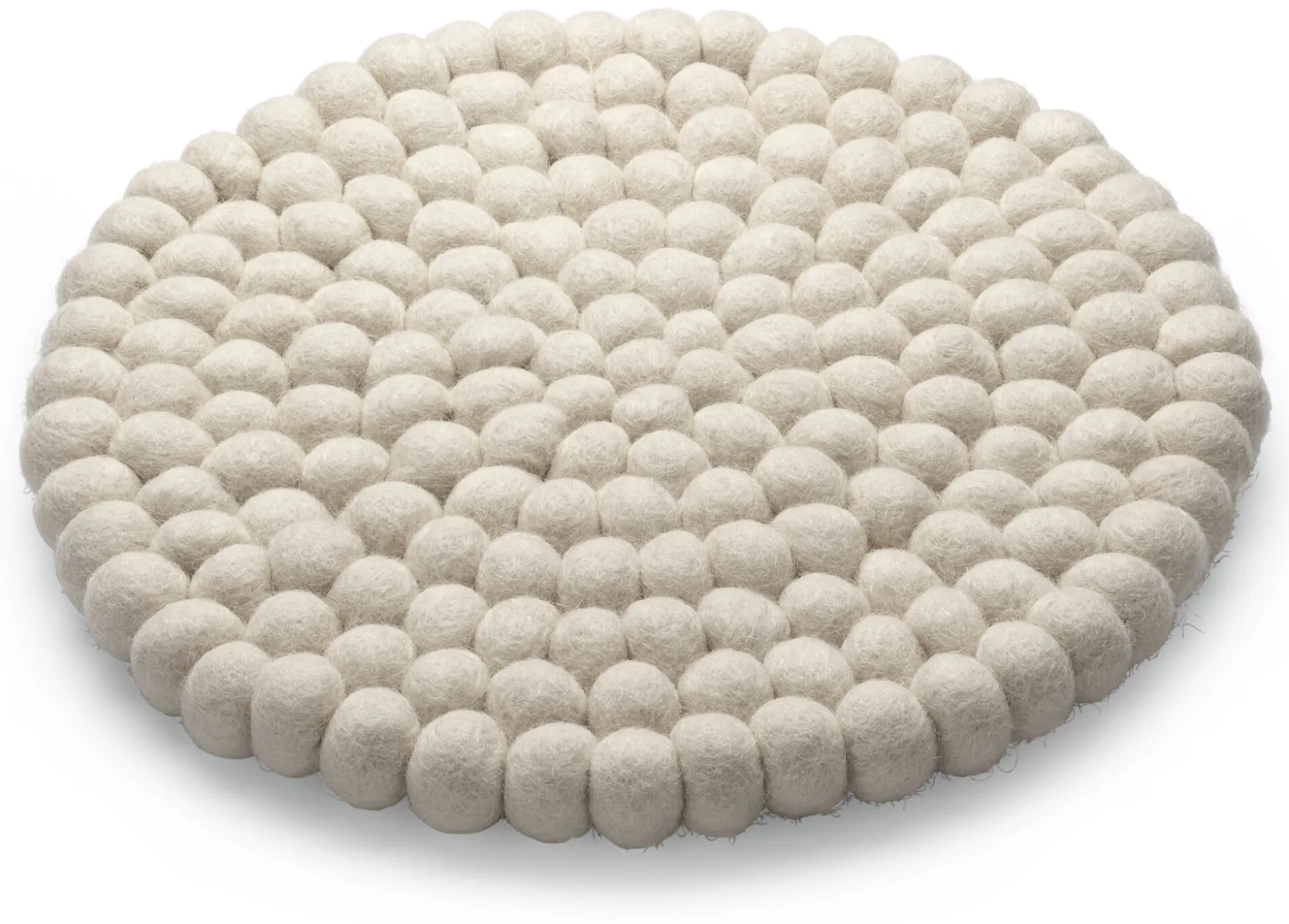 Aus vielen kleinen Filzkugeln entsteht dieser Untersetzer. Dafür werden zunächst von Hand die einzelnen Kugeln aus reiner neuseeländischer Schurwolle gefilzt und in ihre runde Form gebracht und anschließend – ebenfalls in Handarbeit – zusammengenäht. Als Topfuntersetzter schützt die 1,5 Zentimeter starke Filzunterlage zuverlässig die Tischoberfläche. Dass das Material für diesen Einsatz mehr als geeignet ist, verdankt es nicht nur der wärmeisolierenden Eigenschaft der Schurwolle, sondern auch dem Umstand, dass Schurwollfilz zu den am schwersten entflammbaren Naturmaterialien zählt. Er wird daher beispielsweise auch oft auch als Bezugsstoff im Flugzeugbau eingesetzt. Der Filzuntersetzer lässt sich natürlich auch als Unterlage für Vasen, Schalen oder Schüsseln verwenden, um die Tischoberfläche zu schonen. Oder einfach als dekoratives Element.