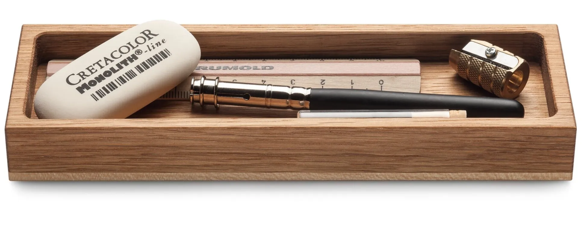 Diese Schreibtischutensilien nehmen auch als gestaltete Objekte Rücksicht darauf: Es sind einfache Ablagen aus geöltem Eichen- und Ahornholz. Sie stammen aus dem bayerischen Steinhöring und sind in ihren Dimensionen so aufeinander abgestimmt, dass sich die Einzelelemente kombinieren lassen. Die kleinere der beiden Stiftschalen mit Griffmulde – ursprünglich für die Präsentation von Schreibgeräten im Schreibwarenhandel entwickelt – wird in Steinhöring infolge nicht nachlassender Kundenanfragen nach unseren Maßgaben gefertigt. Sie bringt die Idee des „weniger ist mehr“ gänzlich auf den Punkt und nimmt ein einziges, mithin das am liebsten und häufigsten benutzte Schreibgerät auf. Alle Ablagen sind für den Schutz der Schreibtischoberfläche mit jeweils vier Kunststofffüßchen versehen.