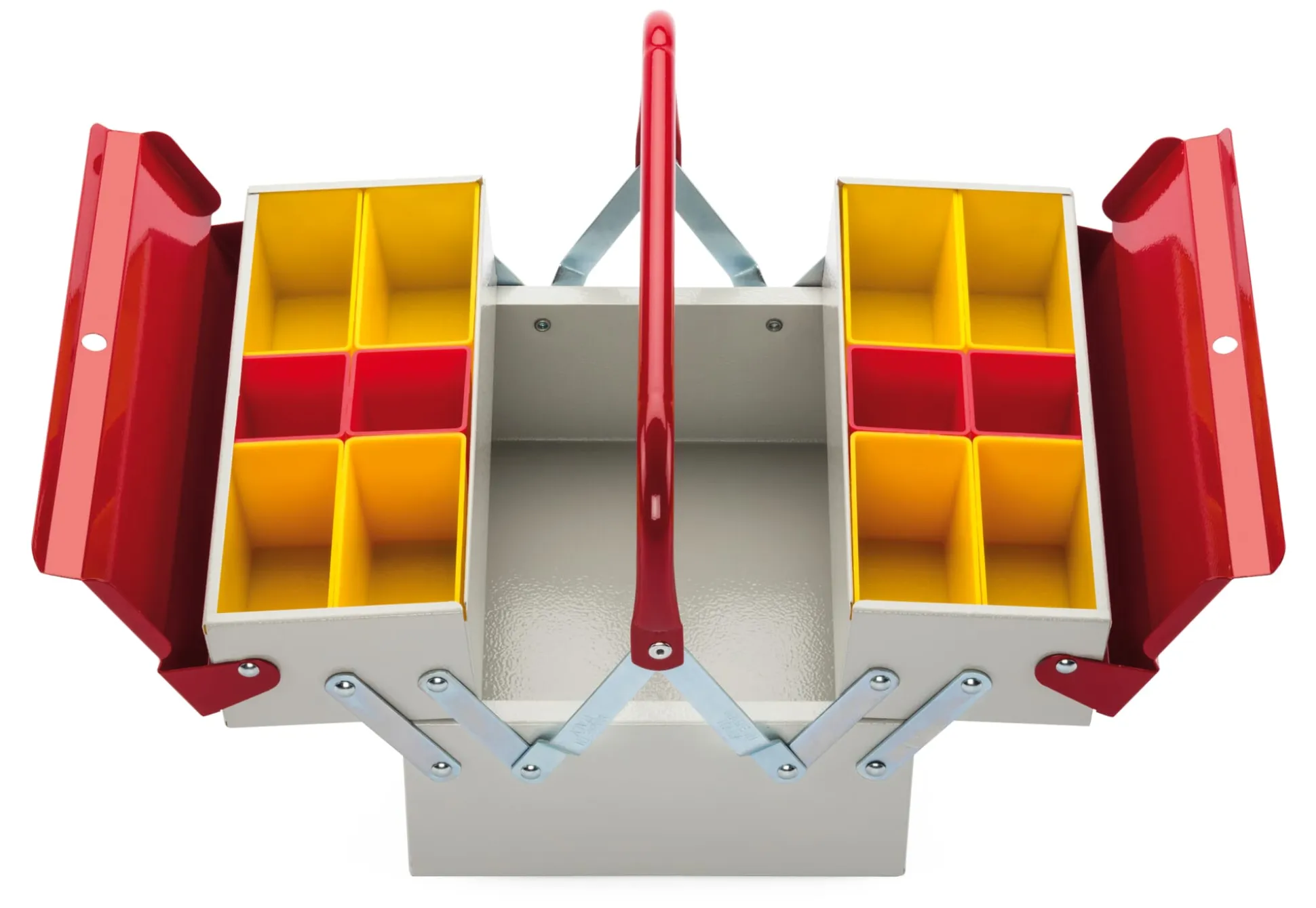 Die amtliche Werkzeugkiste: mit bewährtem Auffaltprinzip, in 1A-Industriequalität und schönen Farbkombinationen. Ungewöhnlich im kleineren Format, auch für Utensilien im Büro, selbst auf dem Schreibtisch und natürlich für Werkzeug in Haushalt und Werkstatt. Mit leicht herausnehmbaren Kunststoffeinsätzen. Belastbar bis 10 Kilogramm.