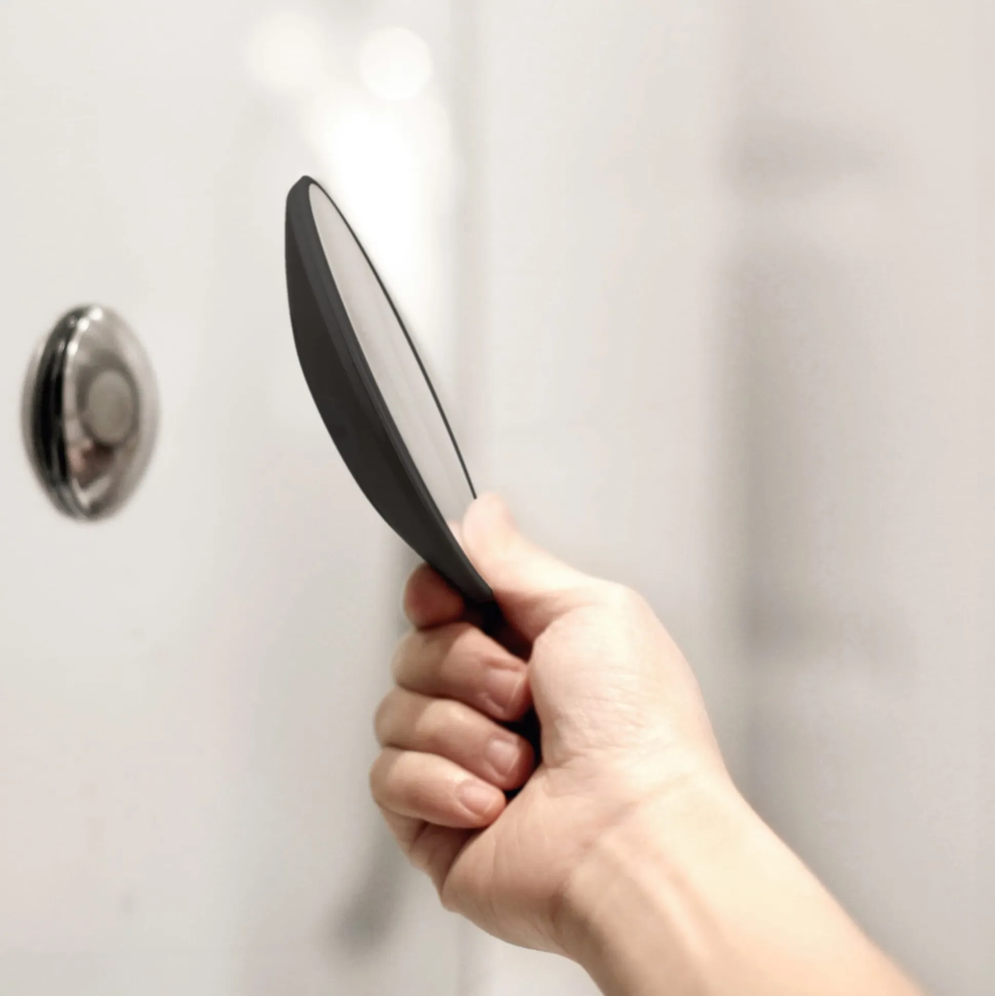 Vergrößerungsspiegel in zwei verschiedenen Optiken: BO besitzt einen per Saugnapf zu fixierenden Fuß aus Edelstahl, dessen Kugelausschnitt formschlüssig in die Rückseite des Spiegels greift. Beide Teile sind von einem Magneten gehalten, lassen sich gegeneinander verschieben und somit in jede gewünschte Position drehen. BO lässt sich leicht auf vielerlei Oberflächen, wie glatte Keramik, Spiegel, Metall und anderen, per Saugnapf fixieren.