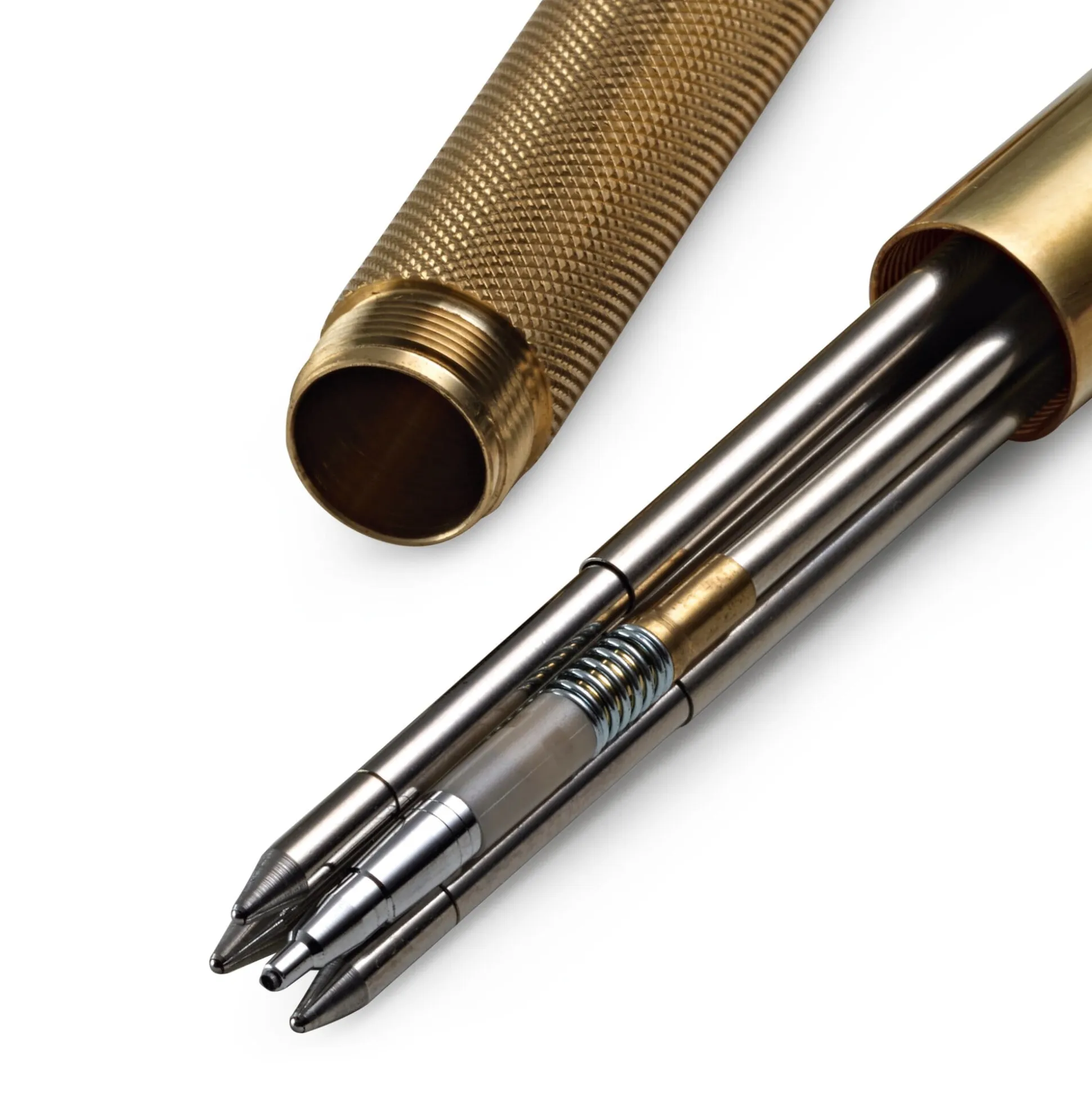 Der Schaft des Stiftes ist aus gezogenem Messing, das Kopfstück mit seiner rutschsicheren Grifffläche aus gedrehtem und gerändeltem Messing gearbeitet. Aus dem unterschiedlich bearbeiteten Material und der daher leicht changierenden Oberfläche entsteht eine besonders markante Ästhetik. Überdies kommt der Stift mit einem Drücker anstelle der üblichen vier Knöpfchen aus. Mit Hilfe einer Sichtwahlmechanik – in Höhe des Clips befindet sich eine zielführende Gravur, die Schwarz, Rot und Blau benennt sowie einen Kreis abbildet – wird auf Knopfdruck jene Mine ausgefahren, deren Beschriftung jeweils nach oben zeigt; das Kreissymbol kennzeichnet dabei die Grafitmine.
