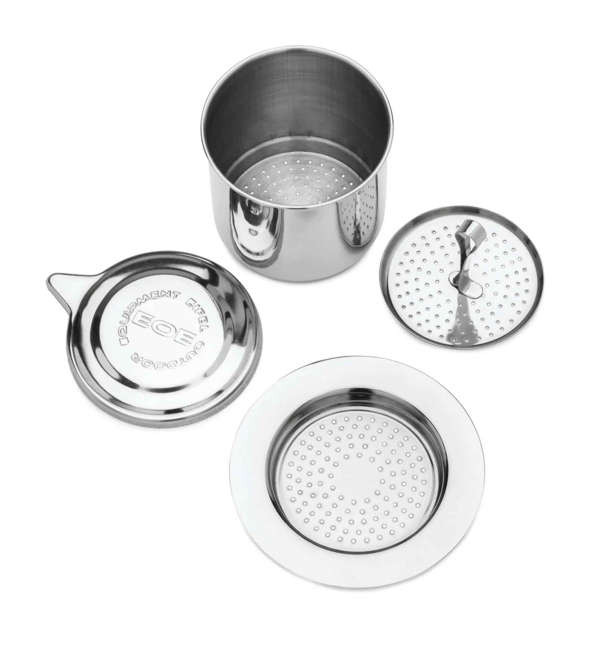 Wird ohne Filtertüte verwendet. Filter (Ø 8,2 cm), Filterkammer (Ø 6 cm), Presse und Deckel aus Edelstahl. Gesamthöhe 6,5 cm. Gesamtgewicht 80 g. Ein passender Stoffbeutel für den Transport im Rucksack oder in der Kochkiste liegt jeweils bei.