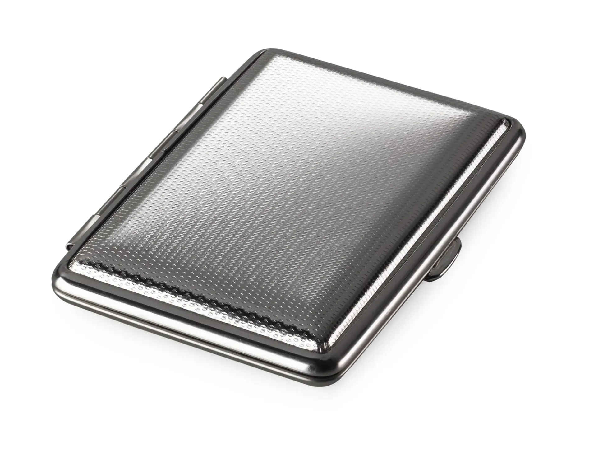 Passend für Karten bis zu einem Format von 86 × 54 mm. Aus vernickeltem Bandstahl. Mit jeweils einem Gummiband im Inneren von Boden und Deckel. Hergestellt in Deutschland. Lieferung ohne Inhalt. Breite 9,5 cm, Tiefe 7 cm, Höhe 1,8 cm. Gewicht 70 g.
