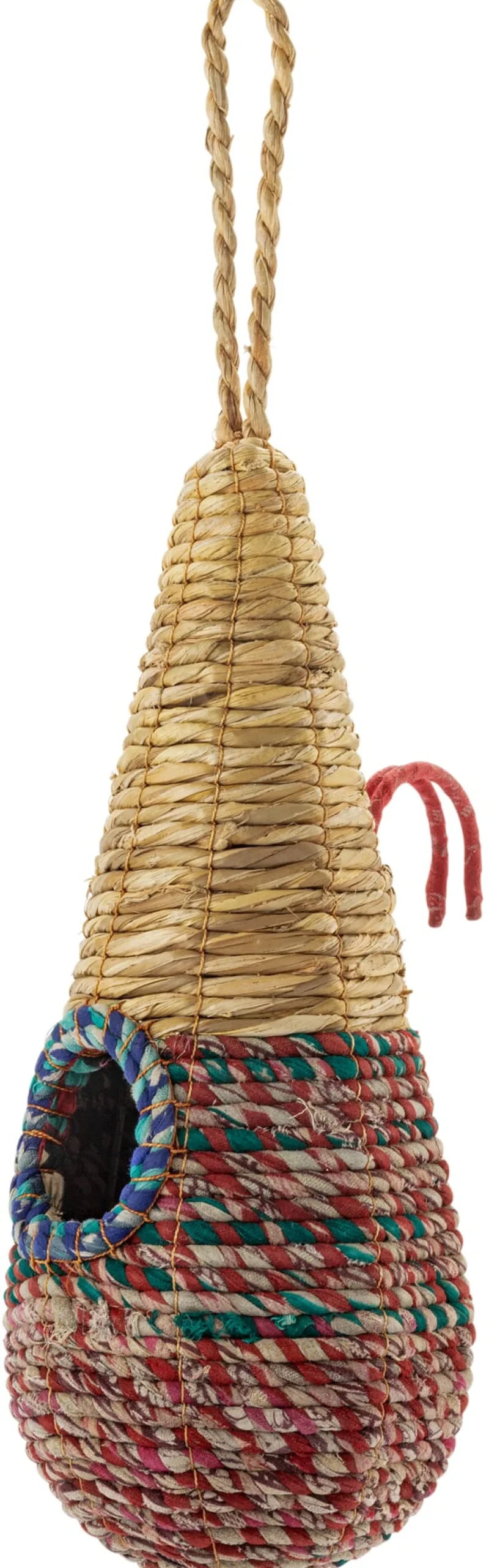 Handgewebt und handgenäht sind diese Vogelnester. Tiny Houses – oder besser gesagt: Tiny Nisthöhlen – aus Fair-Trade-Produktion für die in Ihrem Garten brütenden Wildvögel. Ein stabiler Rahmen aus Metall bildet den Grundriss der Nisthilfe. Ihr Oberteil wird aus naturbelassenem Hogla-Gras gefertigt und ebenso fest um das Gestänge gewickelt wie ihr Unterteil, das aus buntem Baumwollstoff besteht. Nicht aus irgendeinem Stoff allerdings, denn es werden ausschließlich Saris der Altkleidersammlung verarbeitet.