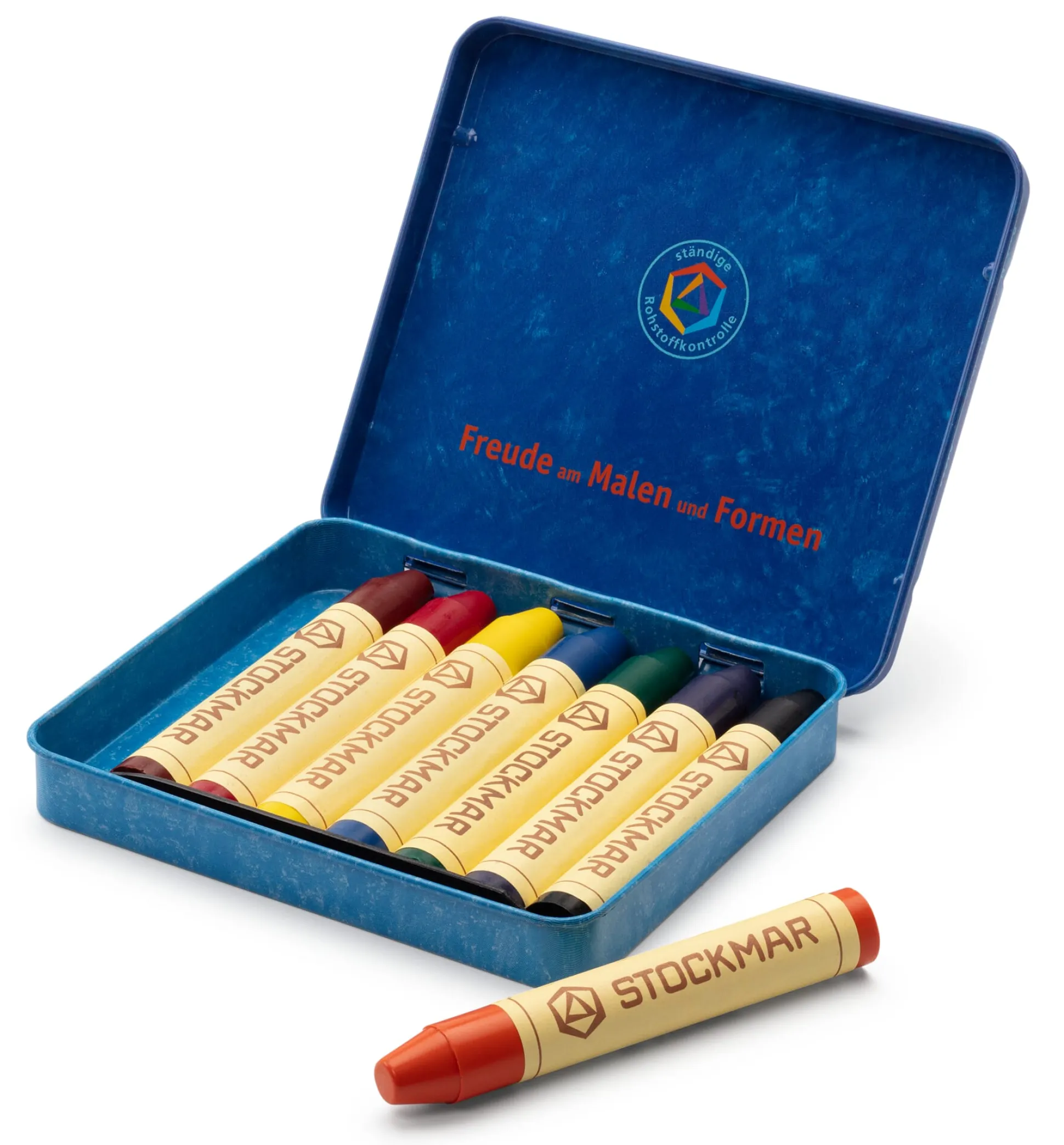 8 Wachsmalstifte, jeweils Länge 8 cm, Ø 1 cm. In einer Blechdose, Breite 10,5 cm, Länge 9,5 cm, Höhe 1,5 cm. Mit Schaber. Gesamtgewicht 135 g.