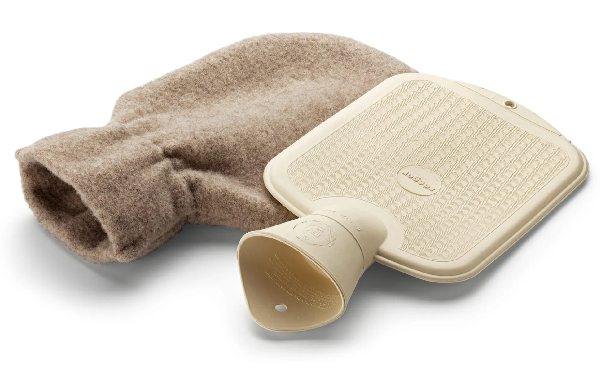 Bis dahin umhüllt der Bezug eine Wärmflasche, die inklusive Halsstück in einem Stück aus Naturkautschuk geformt ist – eine zusätzliche Naht, die brüchig werden könnte, ist dadurch obsolet. Und das vermessingte Gewinde schließt auslaufsicher mit einer stabilen Verschlussschraube (aus Kunststoff).