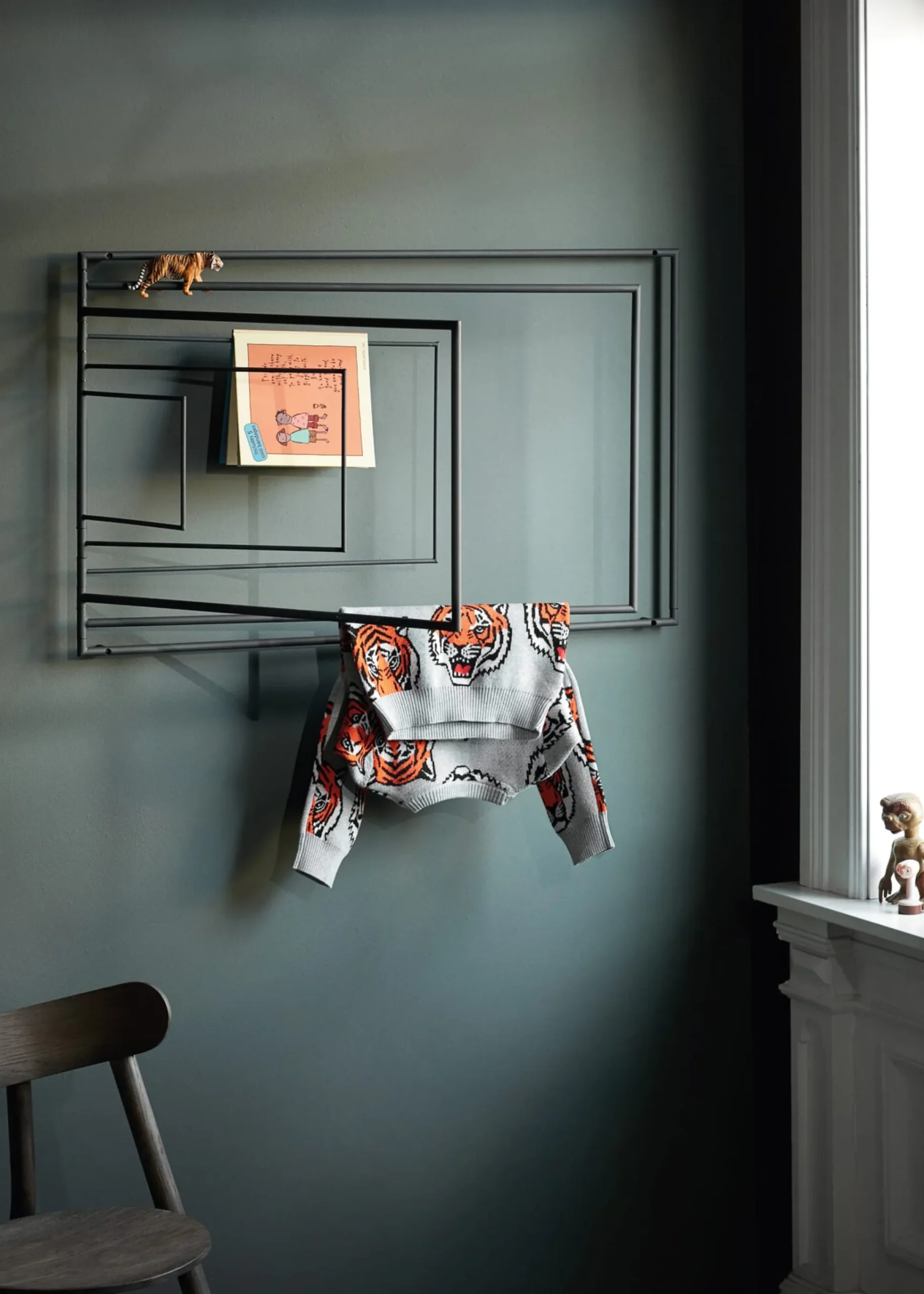 FRAME bringt etwa sechs Meter waagerechtes Rohr von der zweiten in die dritte Dimension! Klingt kompliziert – ist aber simpel, denn aus der flachen, raumsparenden und wandbegleitenden Rohrstruktur lassen sich über die senkrechte drehbare Achse die u-förmigen Segmente zum Raum hin aufklappen und liefern im Handumdrehen nutzbaren Platz. Für Wäsche zum Trocknen und Lüften, für Kleiderbügel und Bekleidungsteile im Flur und selbst für Zeitungen und Magazine. Mit Montagezubehör für die vier Punkte der Wandbefestigung.