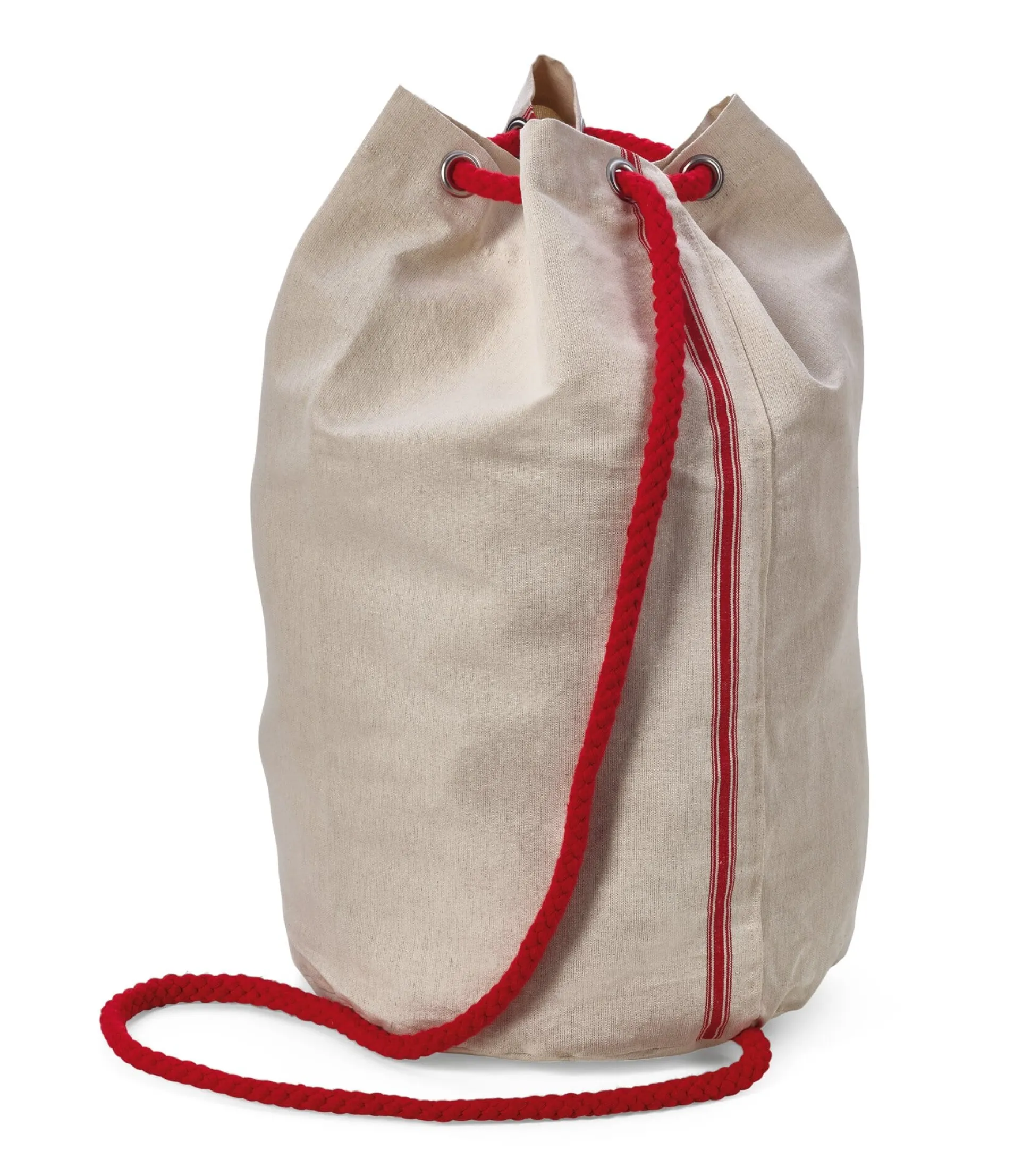 Wir sind uns nicht sicher, ob ein Wäschesack immer als solcher verwendet wird, denn die eigene Erfahrung und Umfragen im Haus zeigen, dass er weder nur auf Reisen die Schmutzwäsche aufnimmt, noch ausschließlich Textiles beherbergt. Doch wofür auch immer Sie ihn verwenden – für die Aufbewahrung oder den Transport von Wäsche, Schuhen oder Spielzeug, Sport- oder Strandsachen etc. –, dieser Wäschesack macht alles mit. Die Leinenweberei Hoffman fertigt ihn aus sogenanntem Mangelleinen, einem sehr dicht gewebten und somit festen, strapazierbaren Halbleinengewebe. Der Name rührt von der früheren Verwendung dieses Gewebes für das Kaltmangeln her. Dabei wird die zu mangelnde Wäsche trocken oder mit etwas Restfeuchte auf ein langes Tuch – das Mangelleinen – gelegt und auf eine Holzwalze gerollt, die unter einem mit Sand oder ähnlichem beschwerten Kasten mit großem Druck hin- und hergerollt wird. Die Wäsche selbst wird dabei zwar schonend geglättet, da keine Hitze nötig ist. Das Mangelleinen jedoch muss sehr strapazierbar und langlebig sein, um dieser Belastung dauerhaft standzuhalten. Entsprechend stabil ist der Wäschesack daraus. Die extradicke Kordel läuft in stabilen, verzinkten Metallösen, die auch mal einen kräftigen Ruck vertragen.