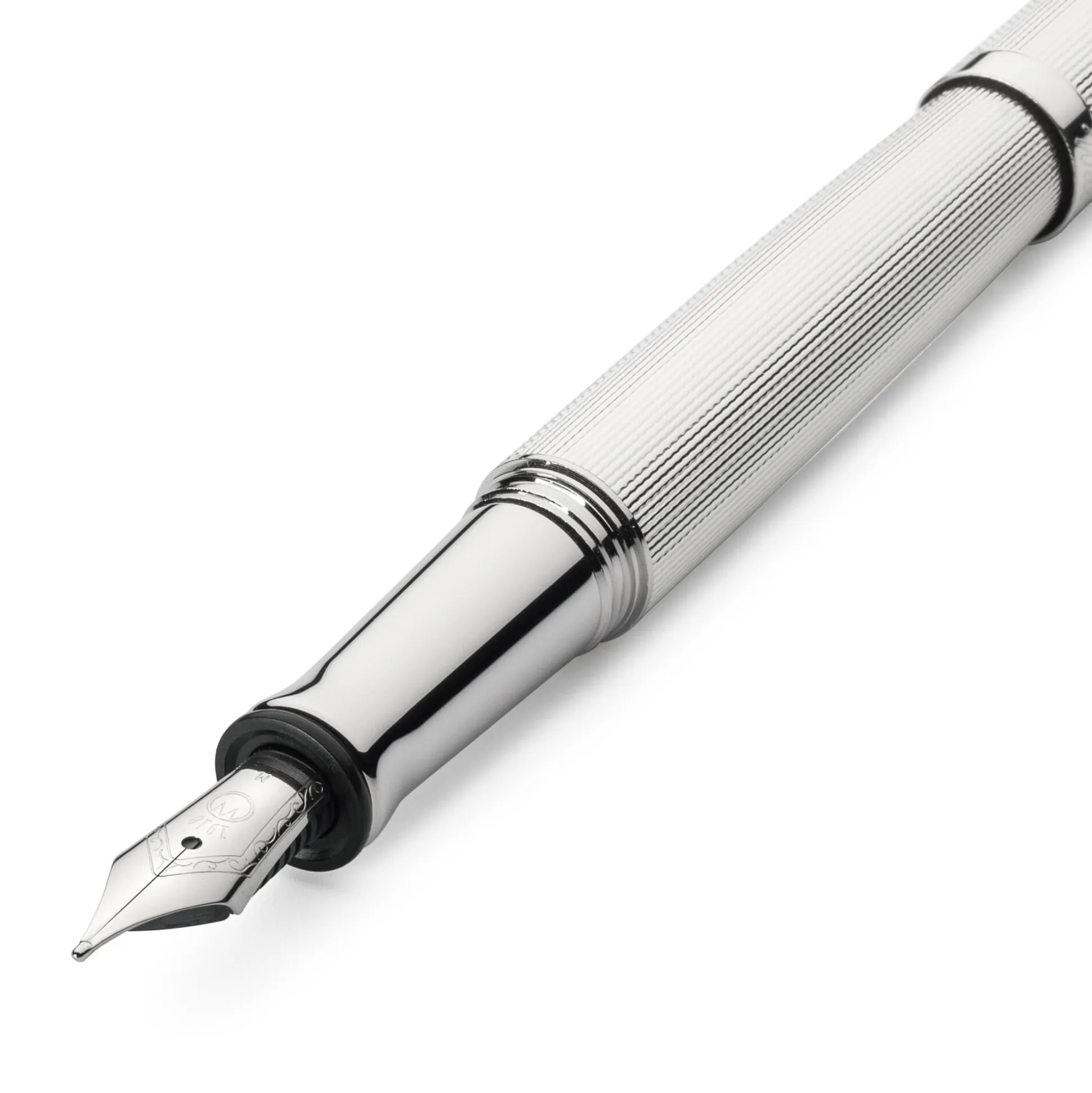 Korpus 925er Silber massiv mit feiner Korn- bzw. Linienguilloche und glänzend poliertem Gravurfeld (30 x 5 mm). Schraubbare Kappe zum Verschließen und Verlängern, Kappengewinde Kunststoff. Clip Stahl vernickelt, rhodiniert. Feder Edelstahl, poliert, mit Iridiumkorn. Länge geschlossen 13,5 cm, schreibfertig 12 cm. Gewicht 40 g. Federbreiten F, M und B (bitte bei der Bestellung angeben). Lieferung mit 6 Standardpatronen in Blau, Konverter und Silberputztuch.