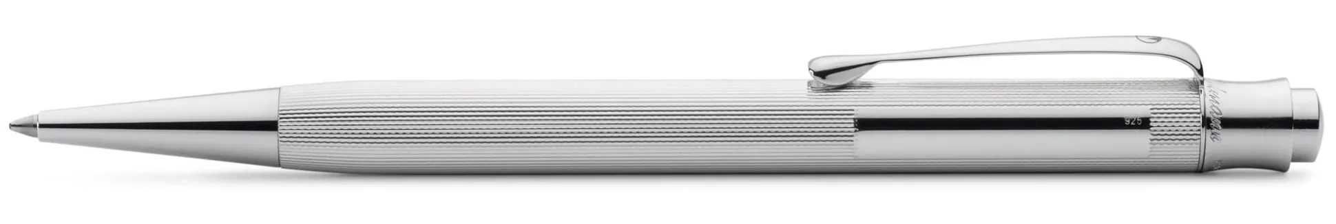 Korpus 925er Silber massiv mit feiner Korn- bzw. Linienguilloche und glänzendpoliertem Gravurfeld (30 × 5 mm). Clip Stahl vernickelt, rhodiniert. Druckmechanik mit Großraummine. Hergestellt in Deutschland.