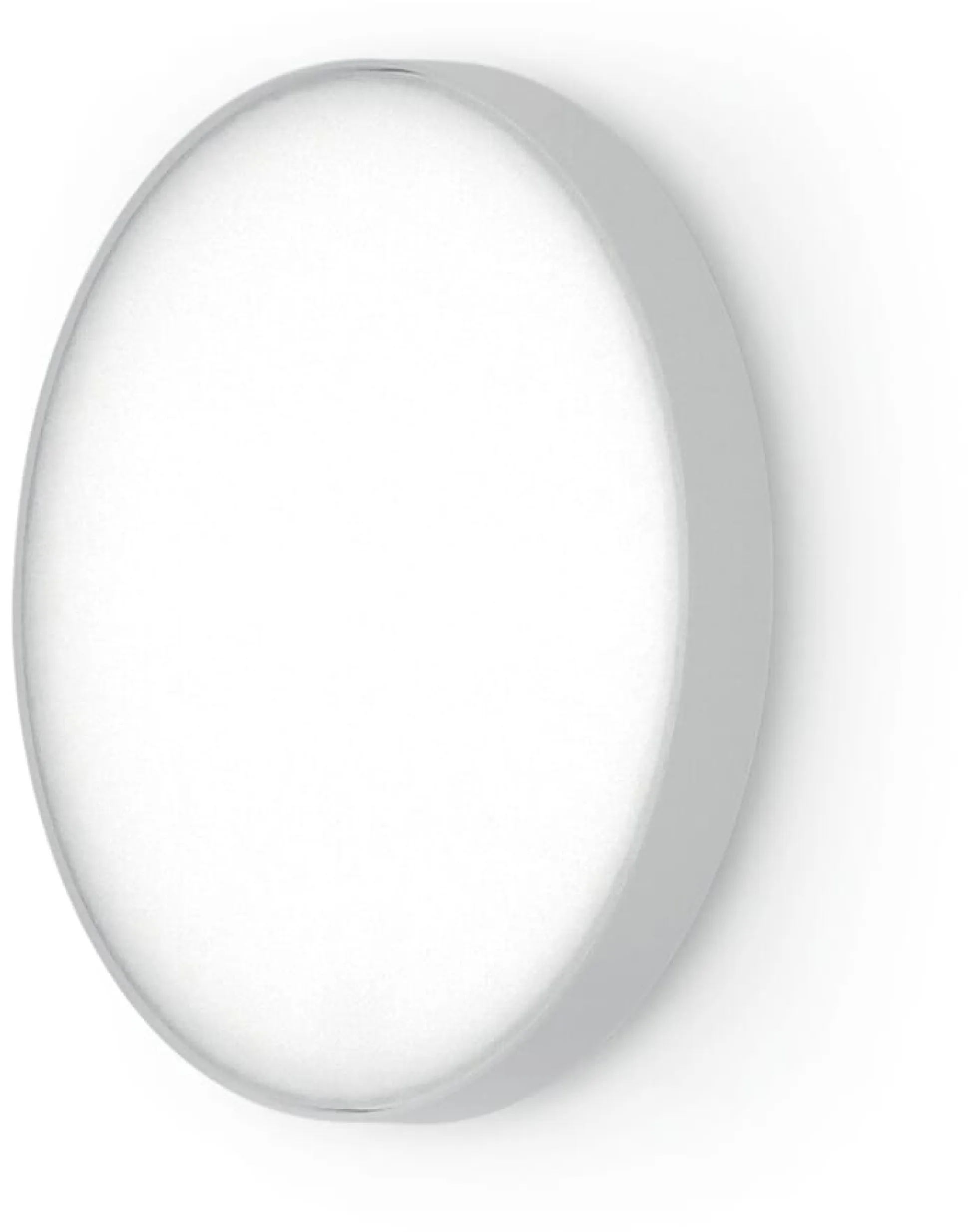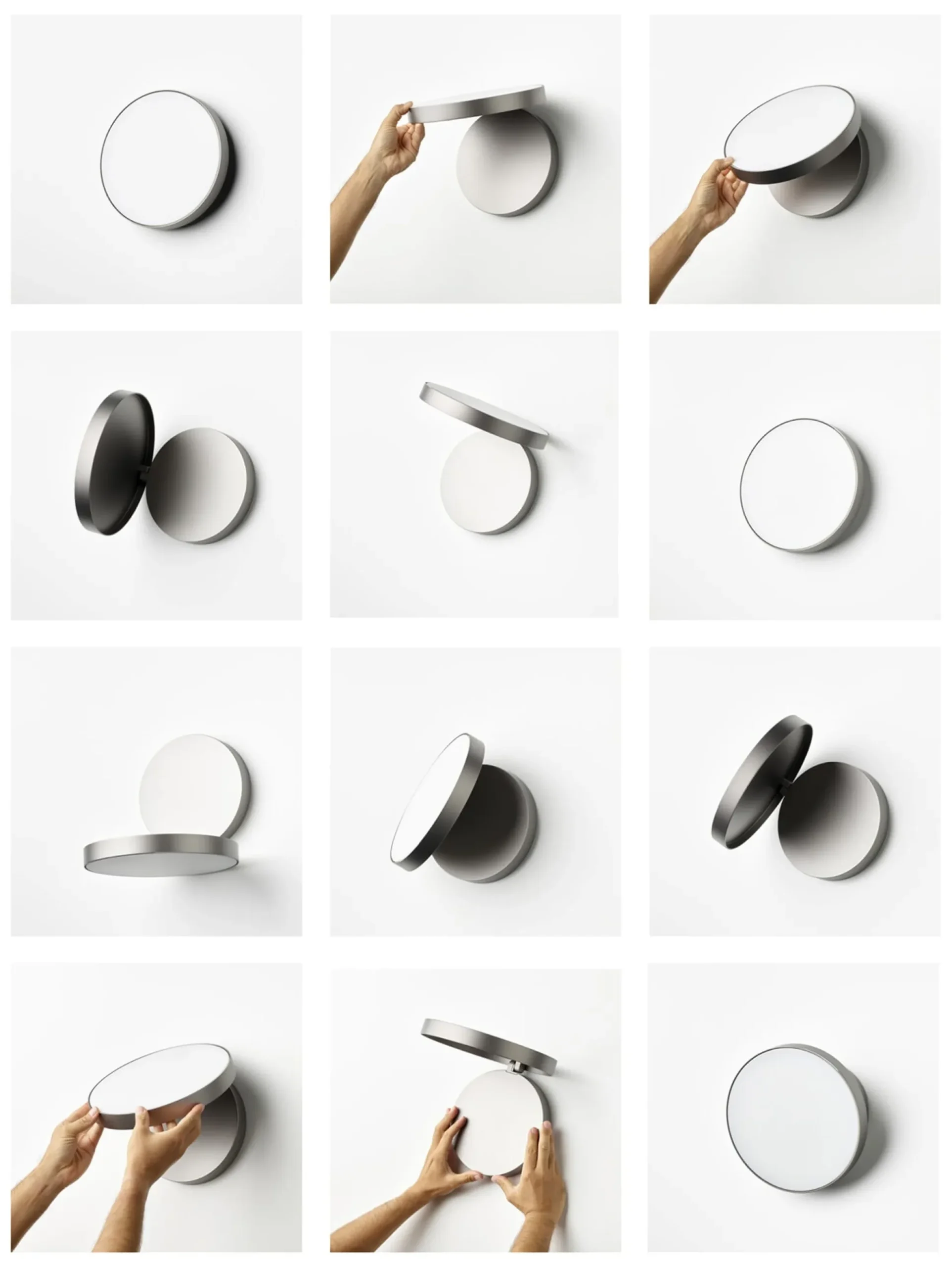 Zwei unterschiedlich große kreisrunde Elemente aus Aluminiumguss sind per Scharnier miteinander verbunden und passen exakt übereinander – wie der Deckel auf eine Schachtel. Die größere Komponente integriert den Leuchtkörper mit Diffusor aus spritzgegossenem, opalen Polycarbonat, während das kleinere Element der Befestigung an Wand oder Decke dient.