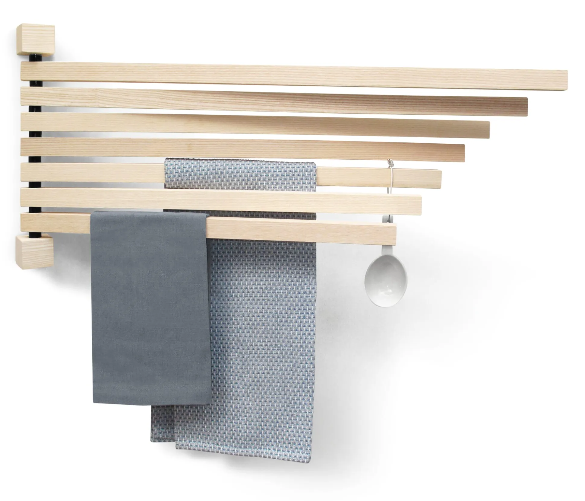 Nützlicher Stummer Diener – wie eine wandelbare Skulptur an der Wand. PAVO ist nutzbar als Garderobe oder Ablage für Bekleidung, als Handtuchhalter in Küche und Bad, für Kochgerätschaft oder als Stativ für Zeitschriften. Interpretierbar in seiner Zweckverwendung und schmuckvolles, handwerklich gearbeitetes Objekt. Lieferbar in zwei verschiedenen Größen.