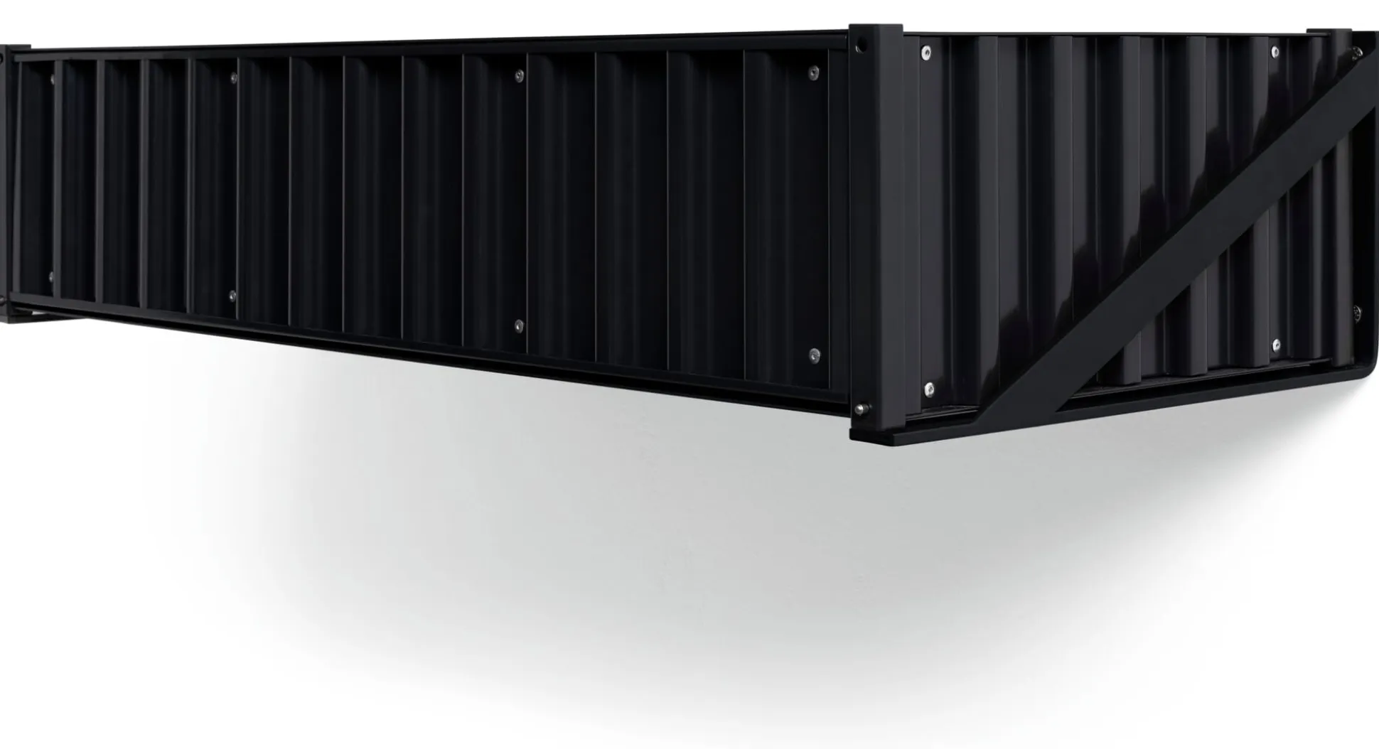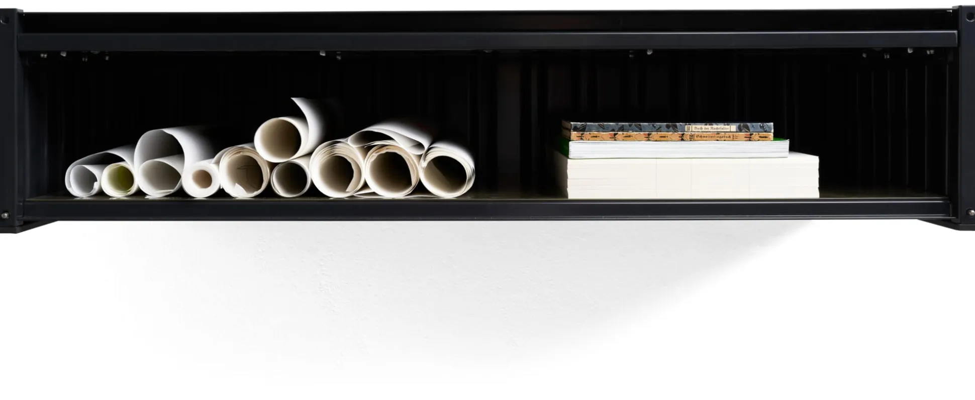 Die Wandhalterung für den CONTAINER DS FLAT. Sie macht aus dem flachen Container eine Wandkonsole, die in verschiedenen Montagehöhen ihren Zweck erfüllen kann: in Fluren oder Arbeitssituationen als Ablage für Vielerlei, über Kopfhöhe montiert als Ablage an Garderobenplätzen.