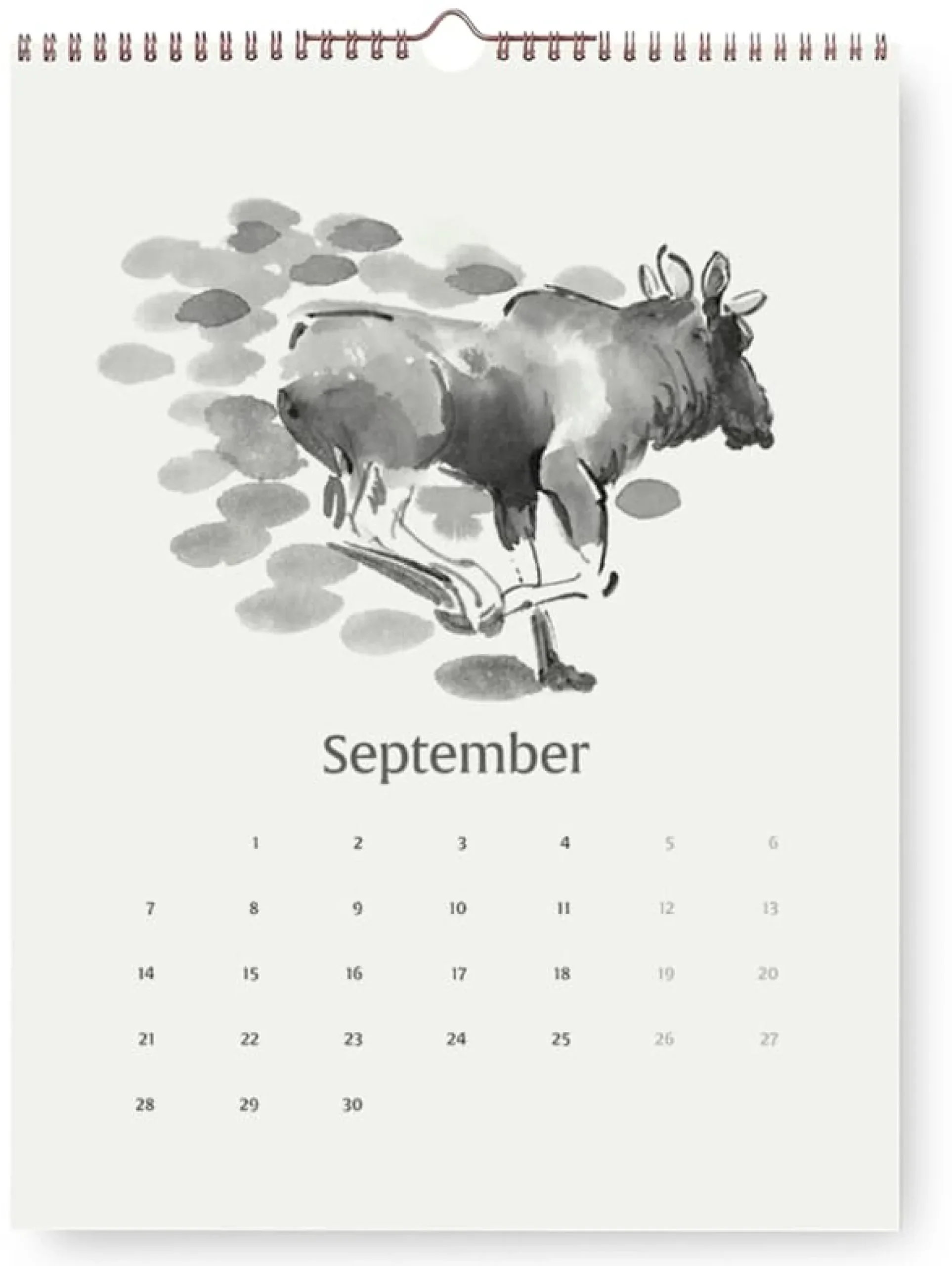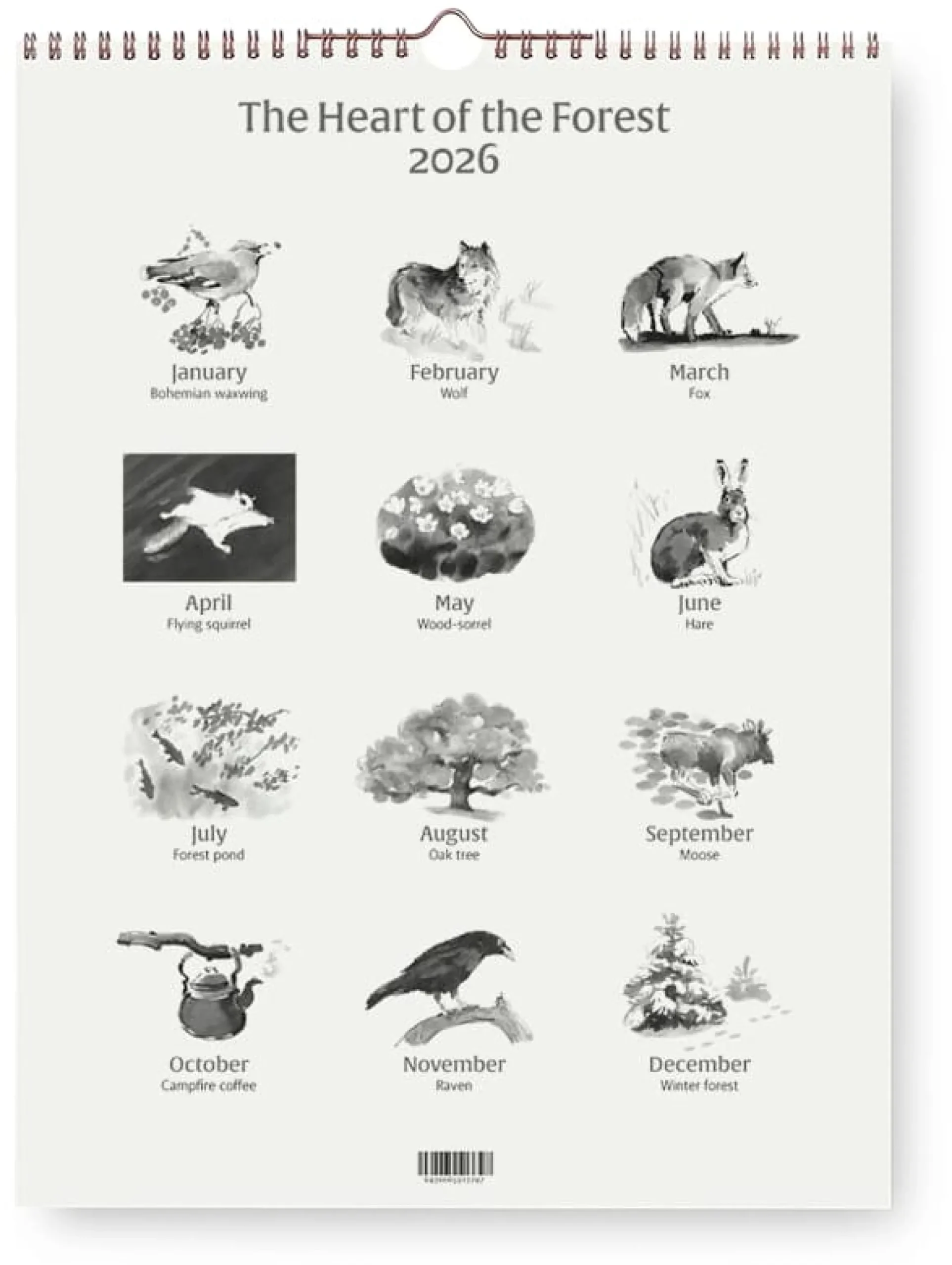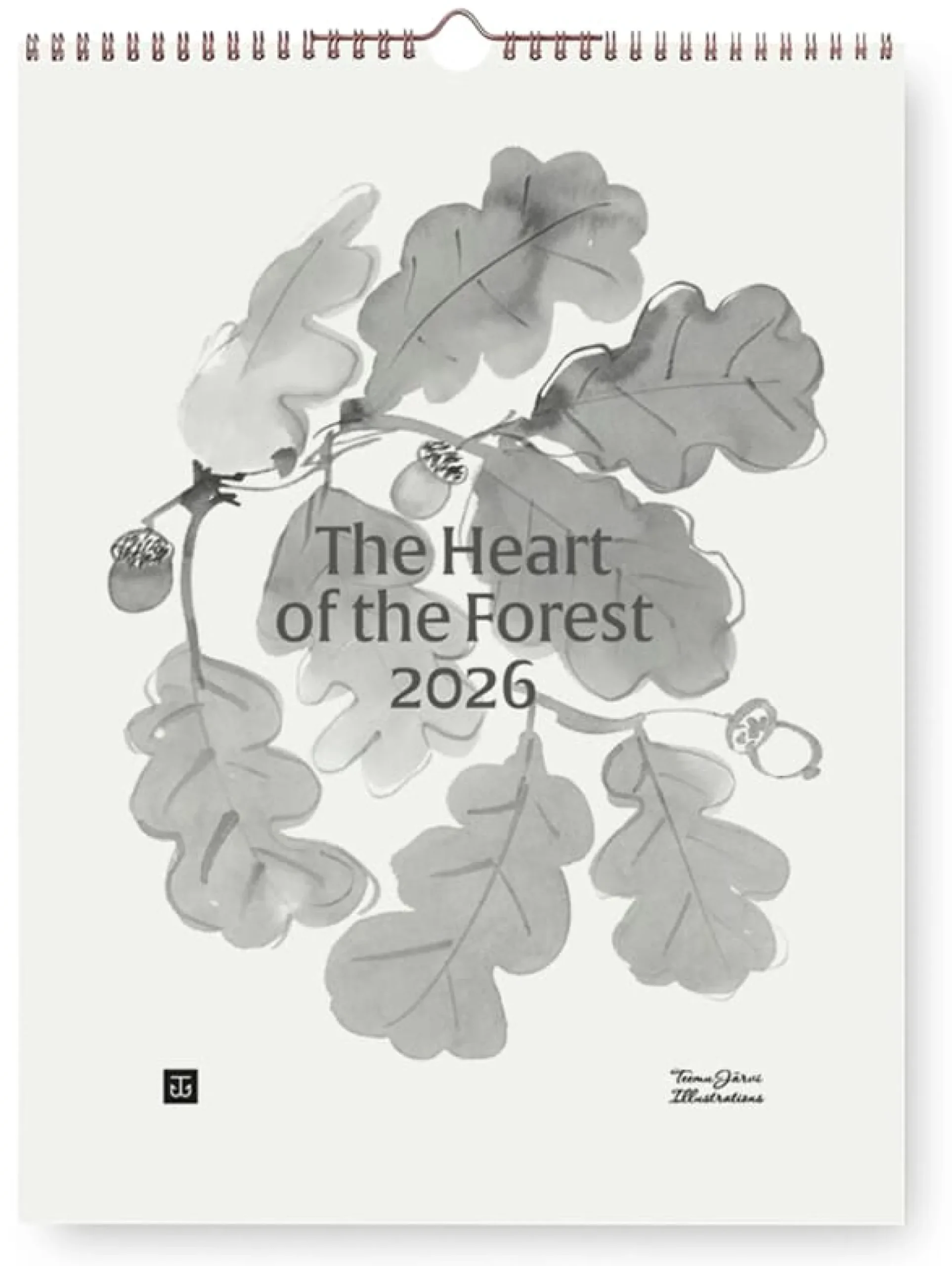Spiralgebundener Wandkalender. 12 Kalenderblätter mit Pflanzen- und Wildtier-Motiven von Teemu Järvi, Digitaldruck auf sandfarbenem Naturpapier (160 g/qm). Format 30 × 40 cm. Hergestellt in Finnland.