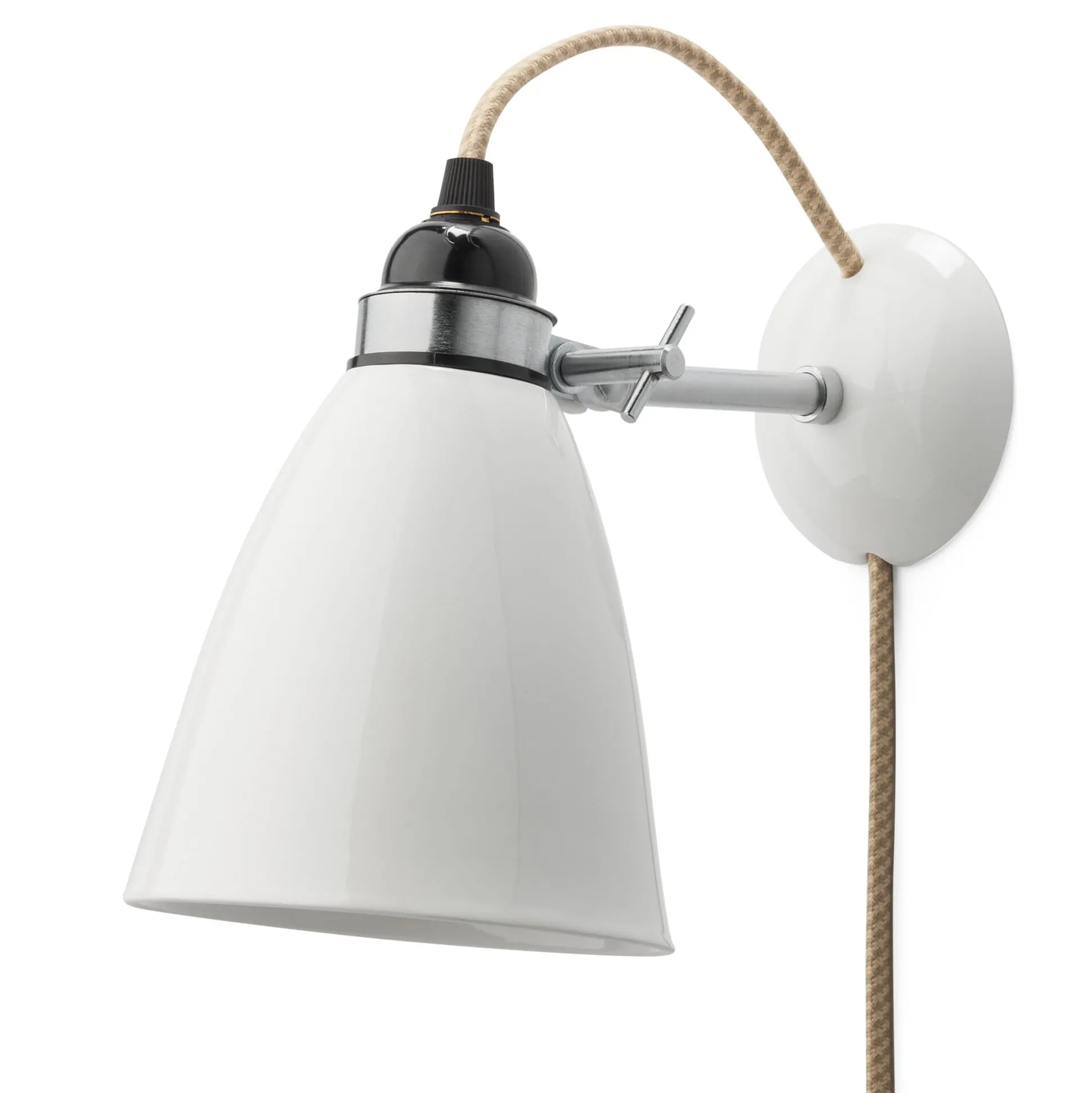 Mit Kabel. Zwischenschalter und Stecker. Wandrosette aus Porzellan, Ø 8,5 cm. Textilkabel, Länge 2,2 m, Eurostecker. Ausladung max. 26,5 cm. Gewicht 660 g.