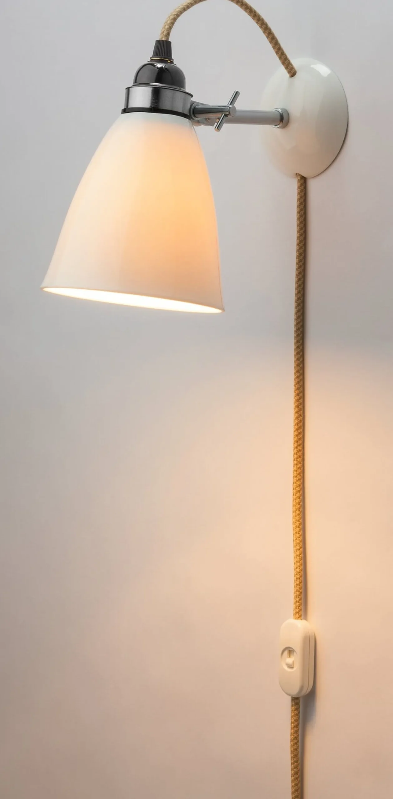 Bei dieser Leuchte zur Wandmontage besteht der Schirm aus Bone China, die Wandrosette aus Porzellan. Geschaltet wird die Leuchte über einen in das Textilkabel eingesetzten Zwischenschalter aus Kunststoff.