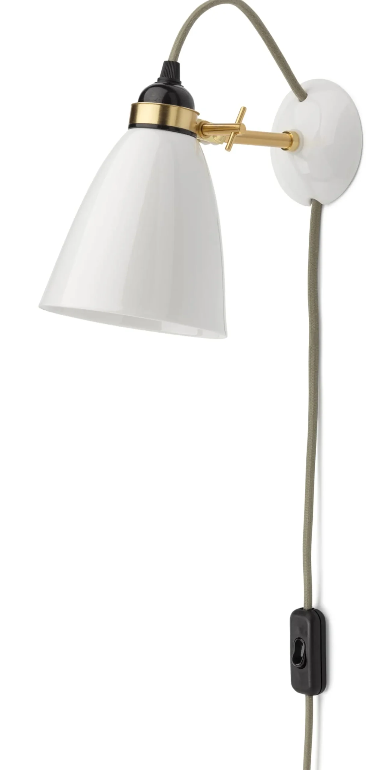 Graues Textilkabel (Länge 2 m, Eurostecker) mit Zwischenschalter aus Kunststoff. Schirm Bone China, Ø 12,2 cm. Stativ Messing. Kunststofffassung E27 (max 40 Watt) Wandteller Porzellan Ø 8,5 cm. Ausladung max. 24,5 cm. Gewicht 650 g.