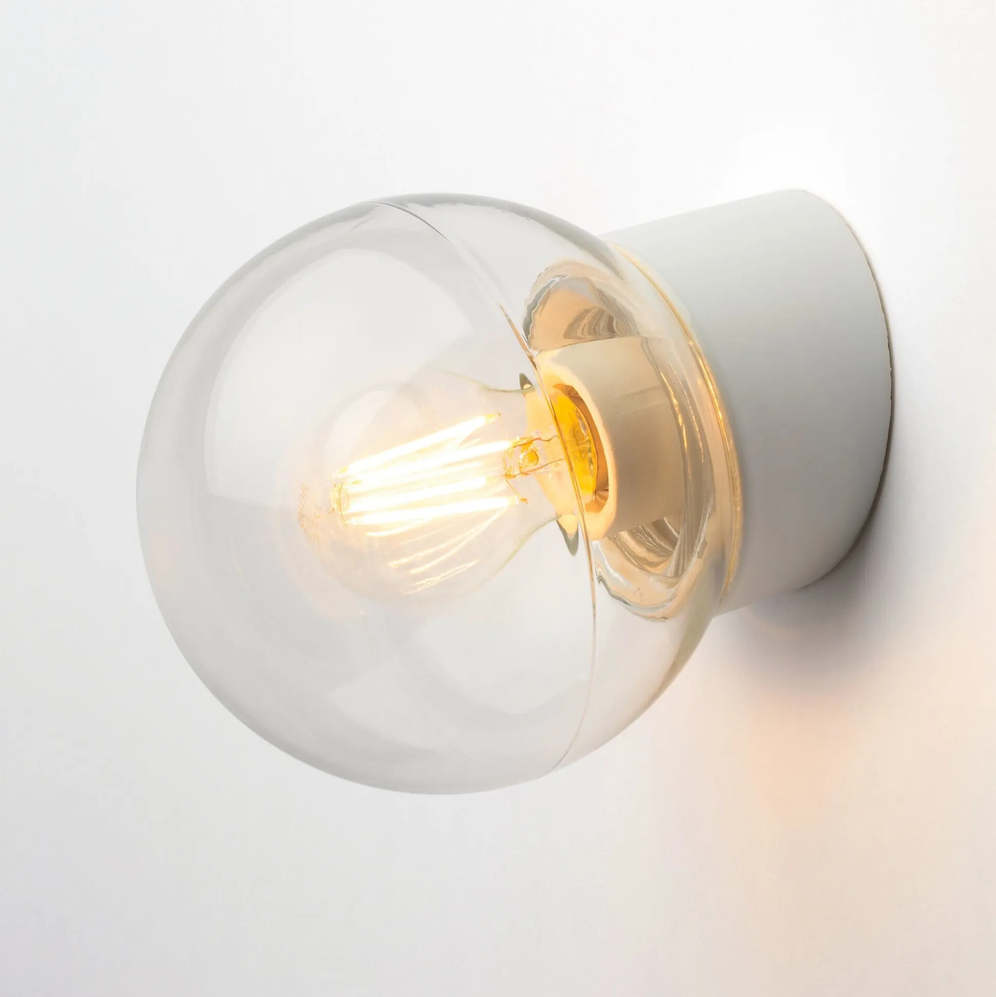 Aus geometrischen Grundkörpern hergeleitet, zeichnet sich diese Wandleuchte durch die gleichzeitig markante und schlichte Kombination von kugelförmiger Glaskuppel und zylindrischem Porzellansockel aus.