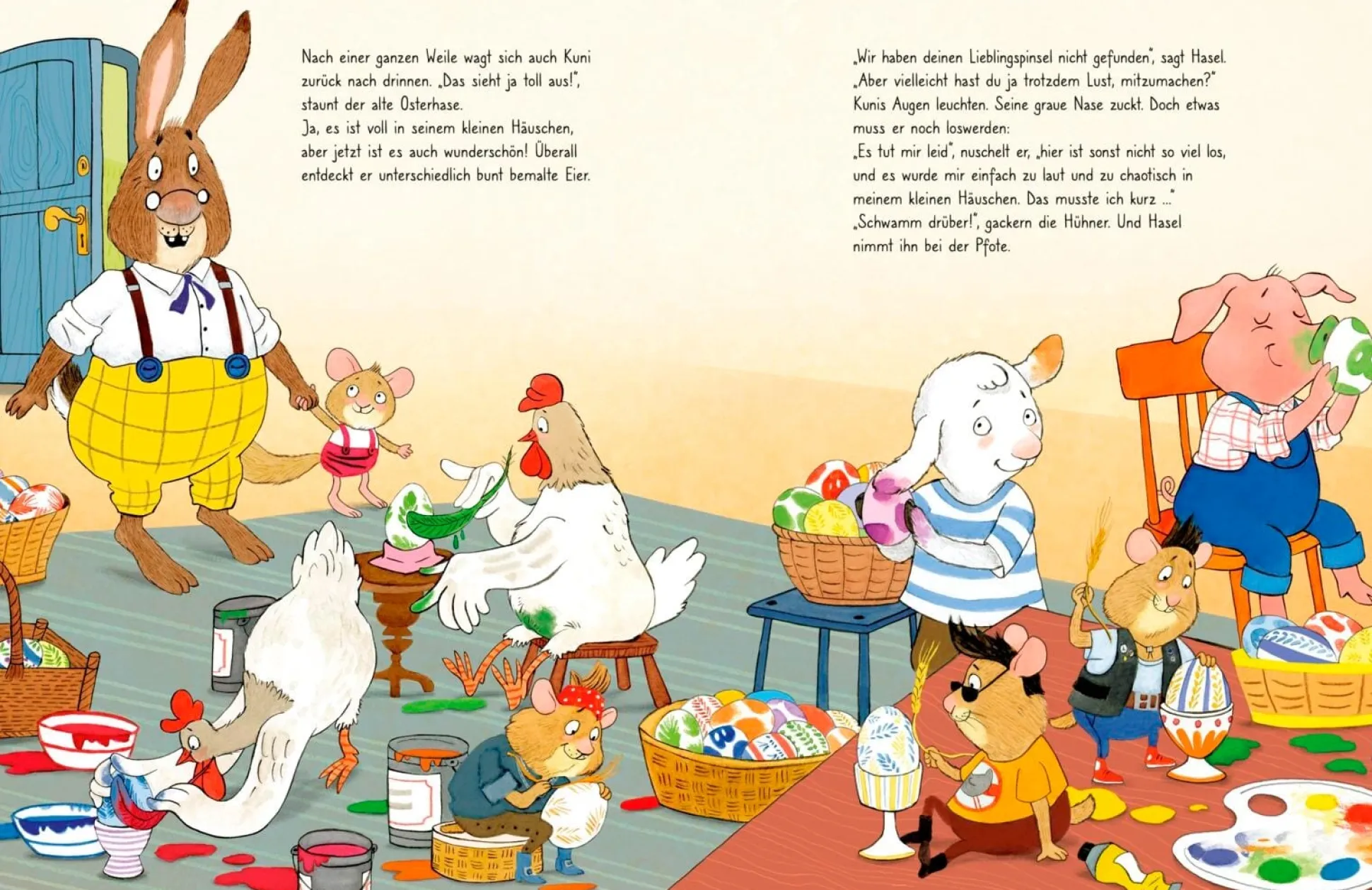 Wenn Ostern vor der Tür steht, dann haben Hase und Huhn so einiges vor. Der alte Osterhase Kuni hat dieses Jahr völlig verschwitzt, rechtzeitig die Eier zu bemalen. Nun muss die Haselmaus Hasel kreativ werden, damit das Fest nicht ins Wasser fällt. Henri und Henriette bekommen einen Schreck, als plötzlich alle ihre Eier verschwunden sind. Gemeinsam suchen sie den Bauernhof ab und finden eine große Überraschung. Die kluge Henne Elli Erbse hat eine famose Idee, wie sie ihre Eier behalten und den Kindern trotzdem eine tolle Osterüberraschung ins Nest legen kann. Und die kleine Lilly Puschel gewinnt den alljährlichen Osterhasen-Wettbewerb mit einer gehörigen Portion Mut.