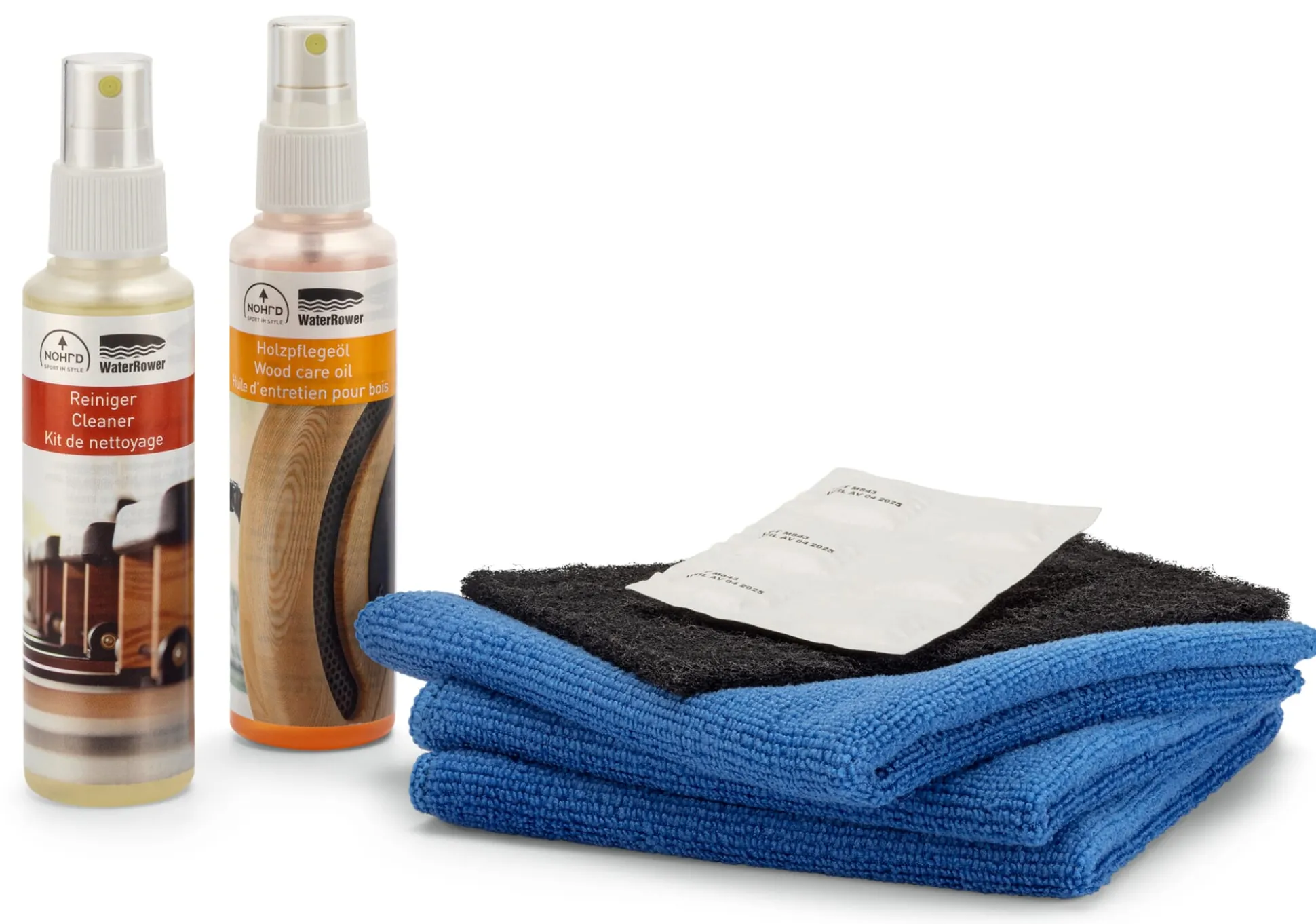 Set für die Reinigung und Pflege des WaterRowers, bestehend aus einem Schleifvlies, 100 ml Reiniger, 100 ml Holzpflegeöl, 6 Puritabs-Pflegetabletten und 3 Mikrofasertüchern.