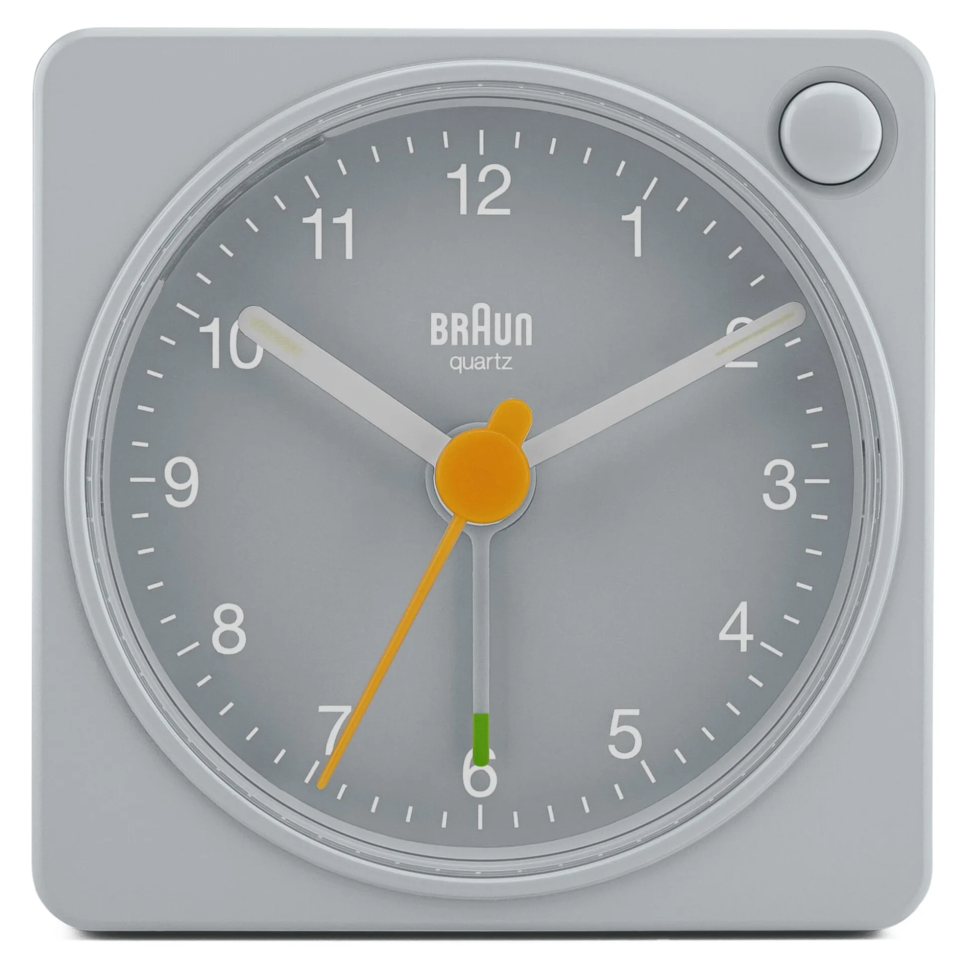 Klassischer analoger Reisewecker von BRAUN, der mit seiner leicht ablesbaren Ziffernblattgrafik sowie dem ikonischen gelben Sekundenzeiger mustergültig für die Designgeschichte von BRAUN steht. Aufgrund seiner kompakten Größe und seiner leichten Bauweise ist er als der perfekte Reisebegleiter zu nutzen. Das ikonische Design dieses klassischen Produkts von BRAUN führt zurück auf den Wecker AB1, der Ende der 80er-Jahre von Dietrich Lubs entworfen wurde. Der Wecker verfügt über ein weiterentwickeltes leiseres Uhrwerk, eine Beleuchtung des Ziffernblatts auf Knopfdruck und nachtleuchtende Stunden- und Minutenzeiger. Mit batteriebetriebenem Quarzuhrwerk für eine AA-Batterie, die nicht im Lieferumfang enthalten ist.