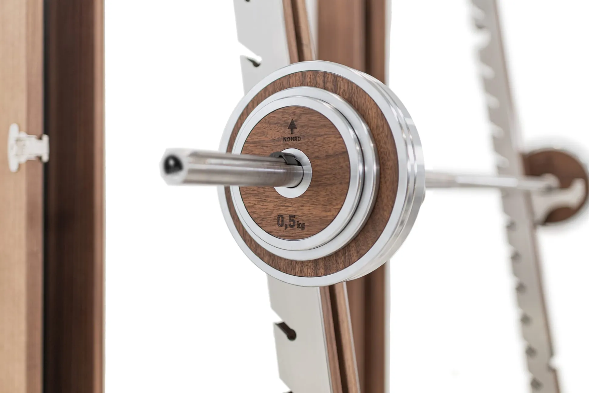 Ein kleiner Kraftprotz ist der WeightPlate Tower von Nohrd – der R2D2 unter den Hanteltürmen, wie wir ihn hausintern nennen – und deswegen ein idealer Partner für Ihr Krafttraining. Dafür bringt er 20 Gewichtsscheiben mit sowie zwei Kurzhanteln und eine Langhantelstange aus Edelstahl (Ø 25 mm). Sein Gestell ist aus massivem Holz gefertigt, wahlweise aus Eiche, Kirschbaum oder Walnuss. Und für die nötige Standfestigkeit sorgt die schwere Grundplatte aus pulverbeschichtetem Stahl. Sieben in der Rückwand fest verankerte Edelstahlhalterungen tragen die Gewichte. Die beiden Kurzhanteln (sogenannte Dumbler) haben ihren festen Platz auf seitlichen Halterungen, die Langhantelstange (der Pumper) wird bei Nichtgebrauch auf der Rückseite des Hantelturms befestigt. Dort bietet eine weitere Halterung Platz für zusätzliche, über unser Kundenzentrum bestellbare 10-Kilogramm-Gewichte (man muss ja Ziele haben). Die Kurzhanteln können Sie jeweils mit bis zu 32 Kilogramm Gewicht bestücken, die Langhantel verträgt 62 Kilogramm. Das integrierte SlideLock™-System der Firma Gungnir of Norway sorgt dabei für maximale Sicherheit und komfortables Handling: Dank dieses patentierten Systems lassen sich die Gewichtsscheiben sicher auf den Hanteln fixieren, eine intuitive Schiebefunktion erleichtert das Einstellen der Gewichte: lift, slide, lock – anheben, schieben, feststellen, einfacher geht es nicht.