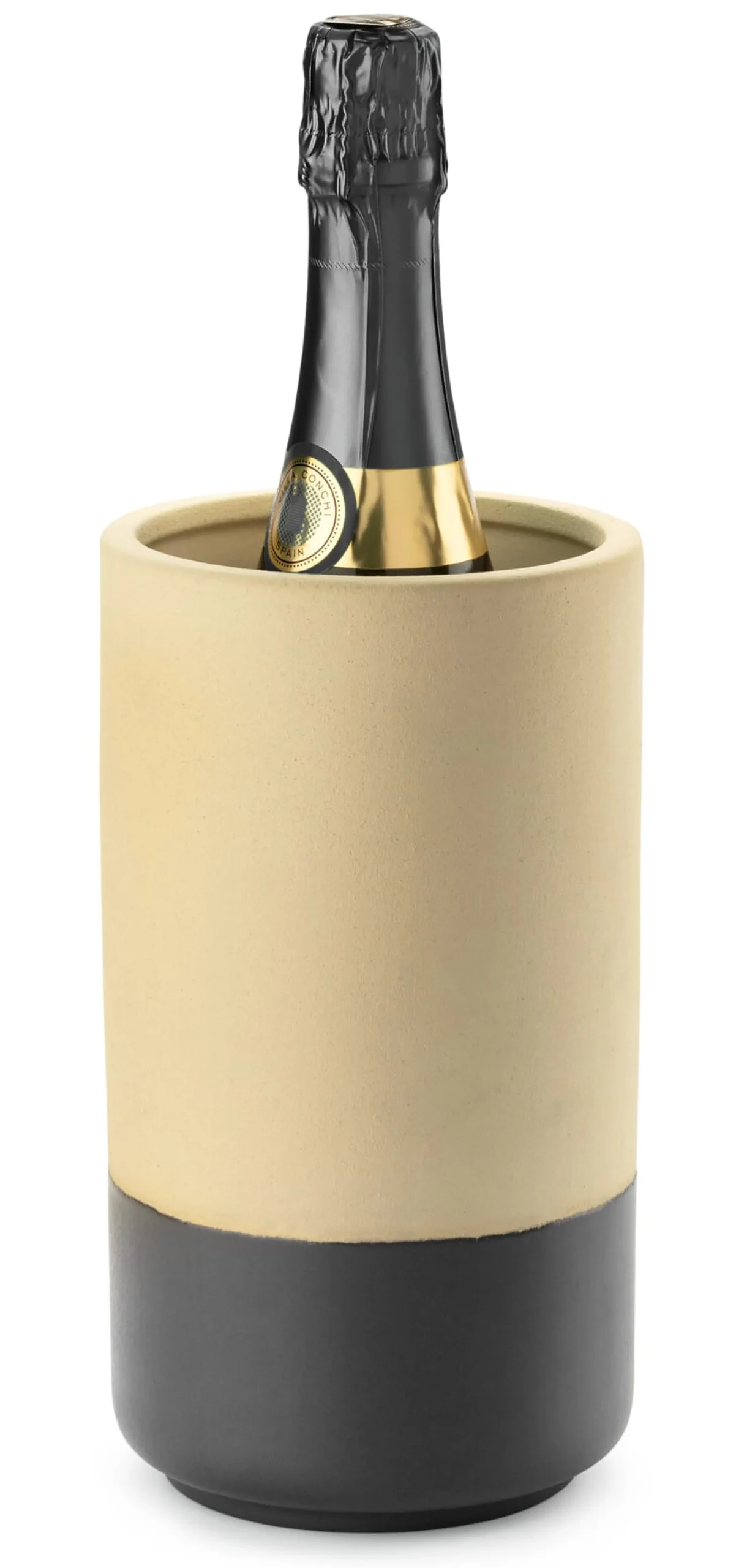Ohne Steckdose, Kühlmanschetten oder Eiswürfel: ein selbstkühlendes Gefäß für Wein und Sekt nach dem Prinzip der Verdunstungskühlung. Wie’s funktioniert? Bei der Verdunstung von Wasser wird Energie benötigt, die in Form von Wärmeenergie der Umgebungsluft entzogen wird. Dies führt zu einer Absenkung der Lufttemperatur. Die konkrete Auswirkung: Aufgrund der Porosität des gebrannten Tons diffundiert Wasser durch die Wandung des Kühlers und verdunstet an der Außenseite. Dadurch wird dem Inneren des Kühlers Wärmeenergie entzogen und die Temperatur deutlich abgesenkt. Die Kühlleistung der Keramik von Kaufmann aus Rehau ist beeindruckend: Wein oder Sekt bleiben stundenlang kühl. Der Boden ist außen mit einer 1/3-hohen mattgrauen bzw. mattweißen Glasur überzogen, die unglasierte Version ist ausschließlich im Innern mit einer transparenten Glasur versehen. Somit wird die Abgabe von Feuchtigkeit zum Boden des Gefäßes verhindert. Um die Wirkung des Kühlers zu aktivieren, muss er in kaltes Wasser getaucht oder einige Minuten mit kaltem Wasser befüllt werden. In diesem Fall hilft viel auch viel, denn je länger er gewässert wird, desto besser die Kühlwirkung.