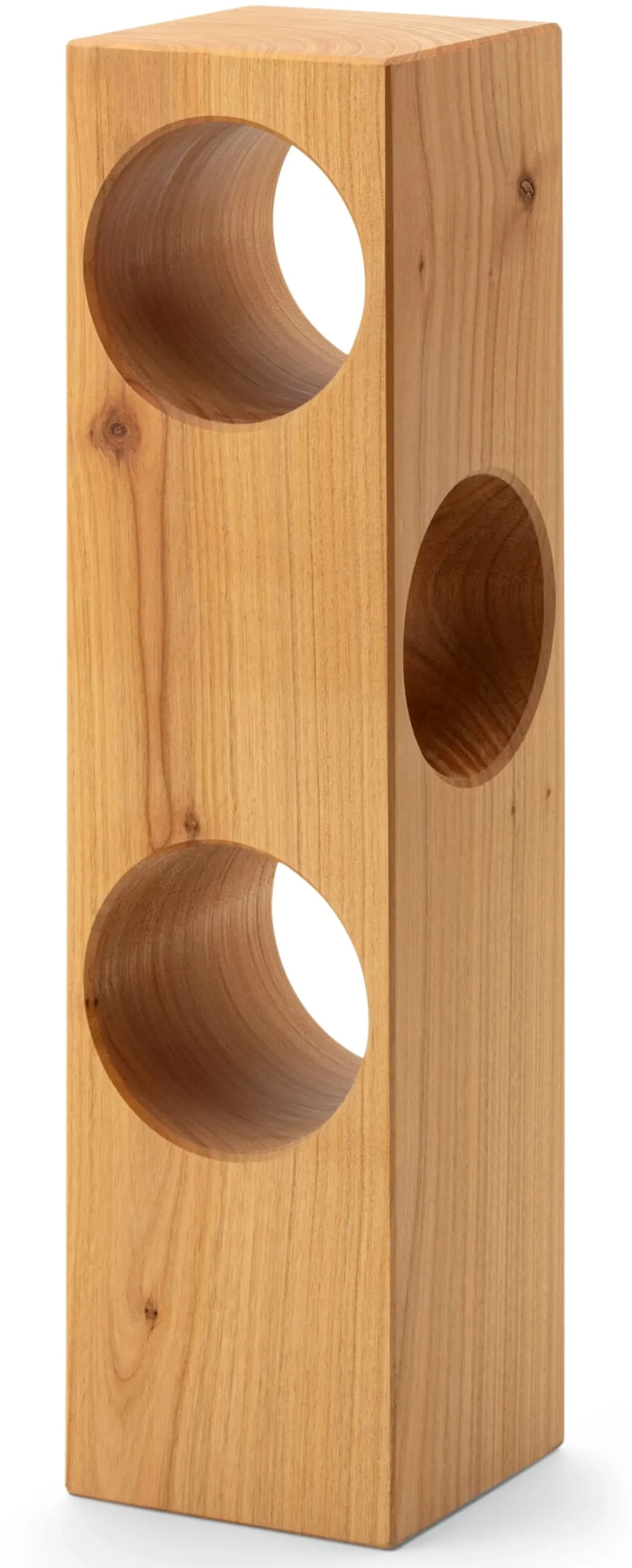 Korpus Eichenholz geölt. Flaschenaufnahmen (Ø 8 cm) in 10, 20 und 30 cm Höhe. Gesamt H 40 × B 10 × L 10 cm. Gewicht 1,3 kg. Liebhaber*innen fränkischer Weine sollten wissen: Bocksbeutel passen nicht in die Flaschenaufnahmen dieses Weinholzes – ebenso wenig Sektflaschen.