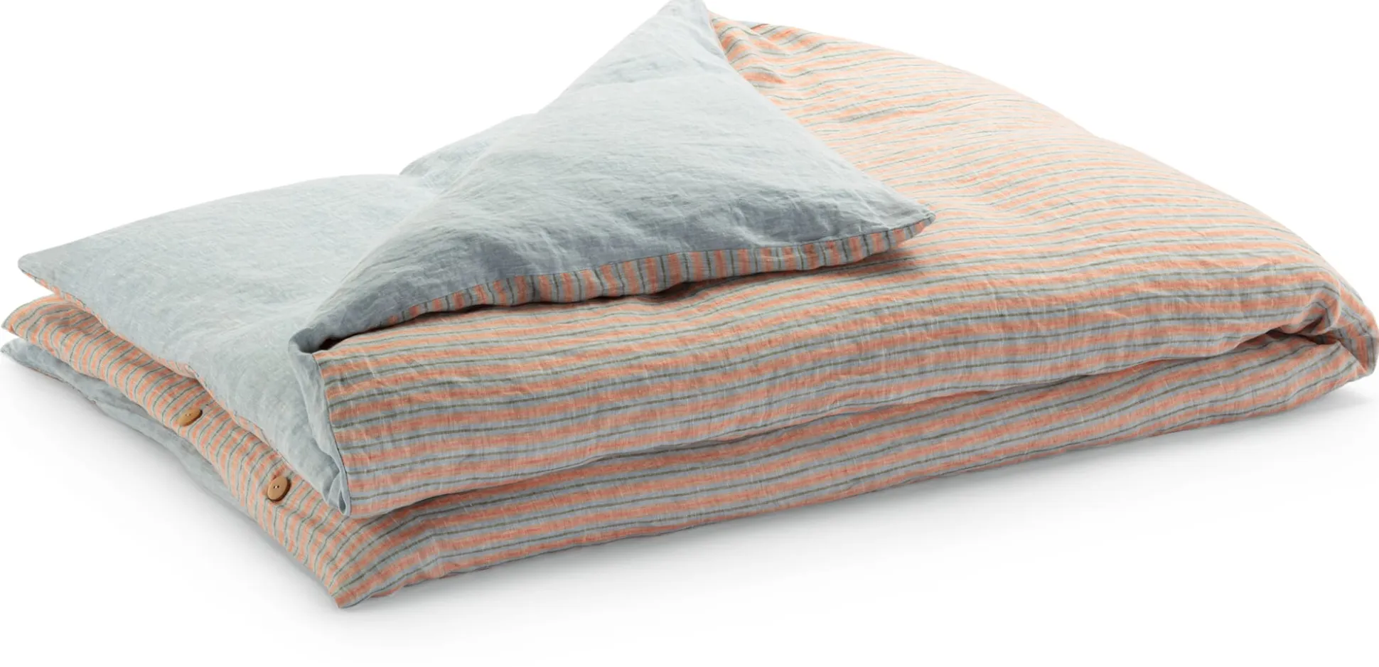 Kühlende Wirkung in sommerlich heißen Nächten hat der Bettbezug selbst, dafür sorgt das Leinen, das hier in Leinwandbindung gewebt ist. Leinen kann gut Wärme leiten und viel Feuchtigkeit aufnehmen, ohne sich dabei feucht anzufühlen. Da es die Feuchtigkeit auch schnell wieder ableitet, wird es als angenehm kühlend empfunden. Zudem ist die Naturfaser von Haus aus antistatisch und zieht kaum Staub an. Aufgrund ihrer glatten Oberfläche sind Leinengewebe hautfreundlich und leicht zu reinigen. Das Leinen für diese Bettbezüge ist vorgewaschen und hat nichts mehr von der für Leinen typischen anfänglichen Steifigkeit. Mit jedem Waschen wird es zudem noch weicher. Mit einem Flächengewicht von 140 g/qm ist das Gewebe eher leicht und schmiegt sich angenehm an den Körper an. Der Bezug wird mit Holzknöpfen geschlossen.