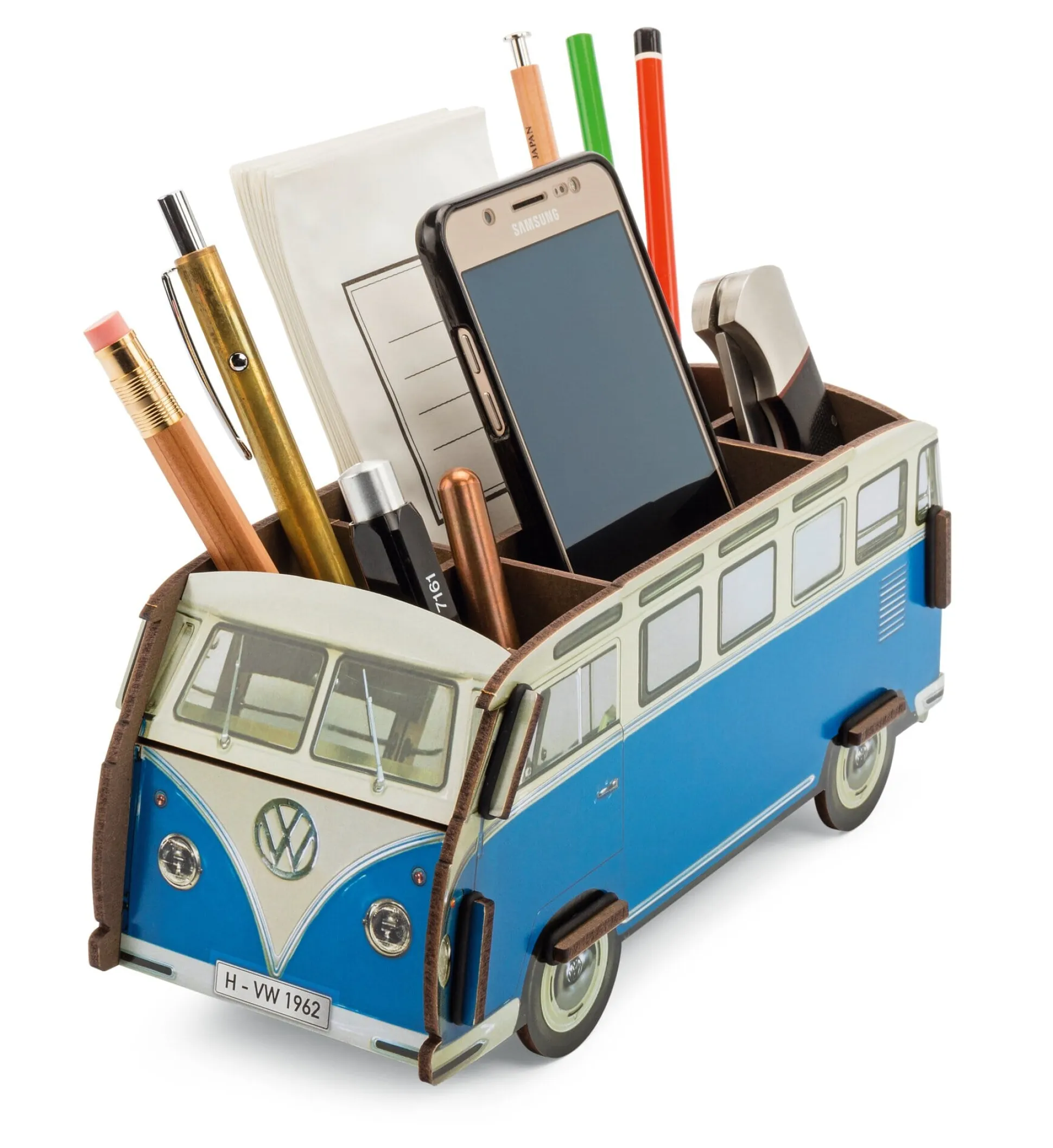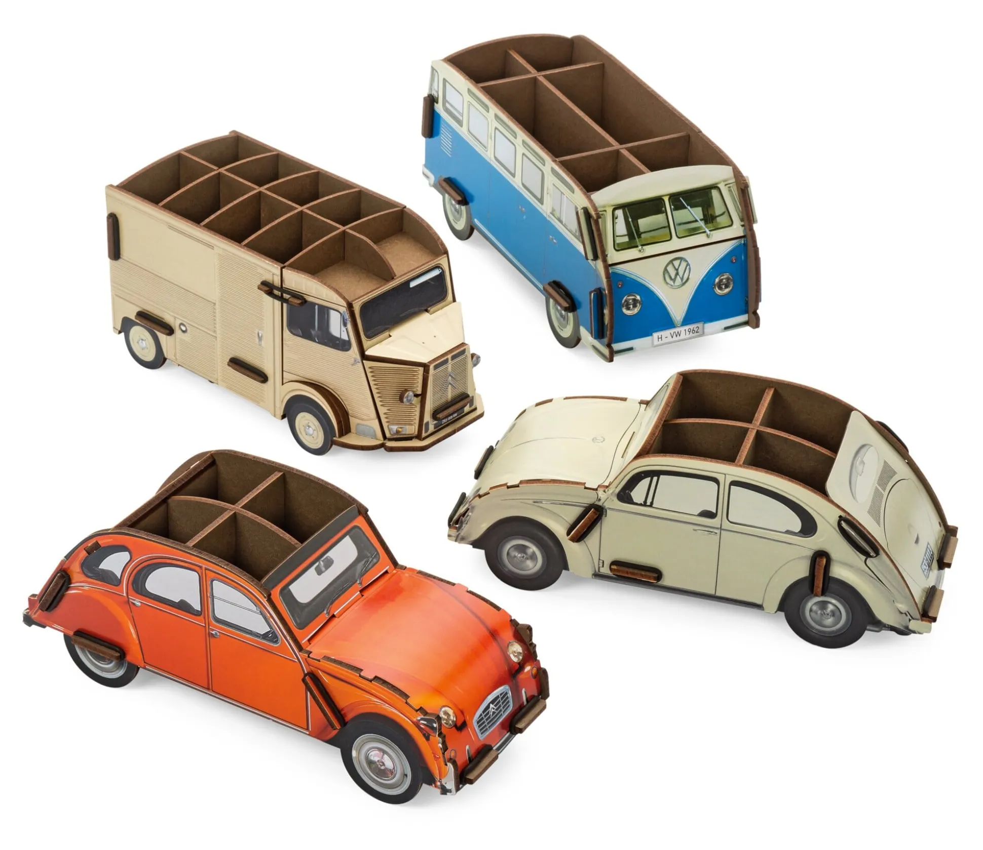 Kleiner als die Truhenhocker gleicher Gestaltung, aber deshalb nicht weniger praktisch: Die Stifteboxen von Werkhaus – als Tier oder in Form eines legendären Fahrzeugmodells. Neben Stiften und Büroutensilien findet hier auch allerhand anderer Kleinkram (wie etwa Werkzeug) Platz.