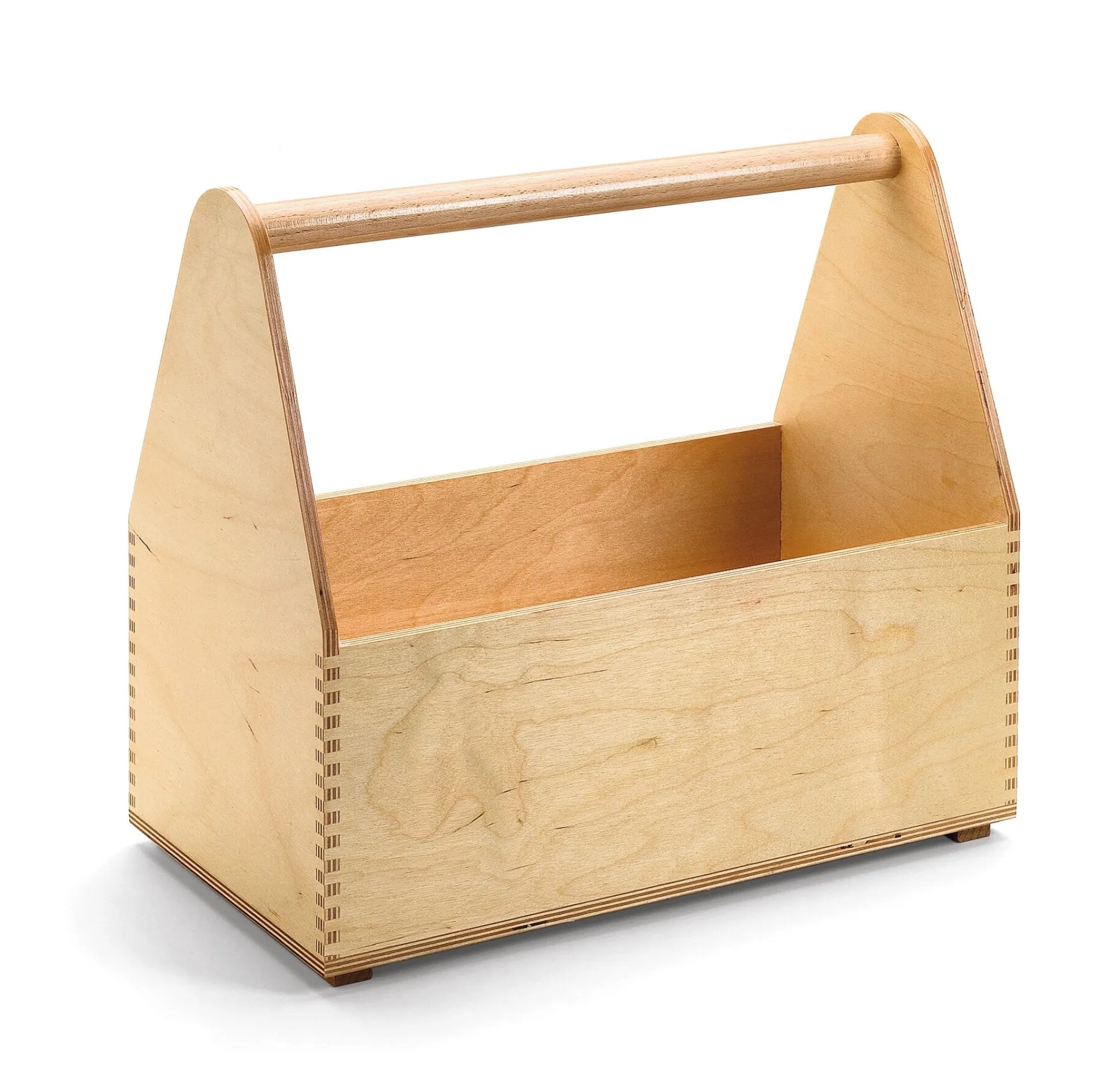 Dies ist das Transport- und Aufbewahrungsbehältnis für Werkzeug in seiner klassischen Form und in hochwertiger Verarbeitung: Es bietet Platz für eine Grundausstattung an Garten- und Heimwerkzeug (wahlweise, je nach Bedarf, an Reinigungsmitteln oder Schuhputzutensilien). Die Seitenteile sind über eine schöne und sehr haltbare Holzverbindung (nämlich über Fingerzinken) verbunden; dank der schmalen, hohen Form kann das Behältnis auch bequem am Körper getragen werden.