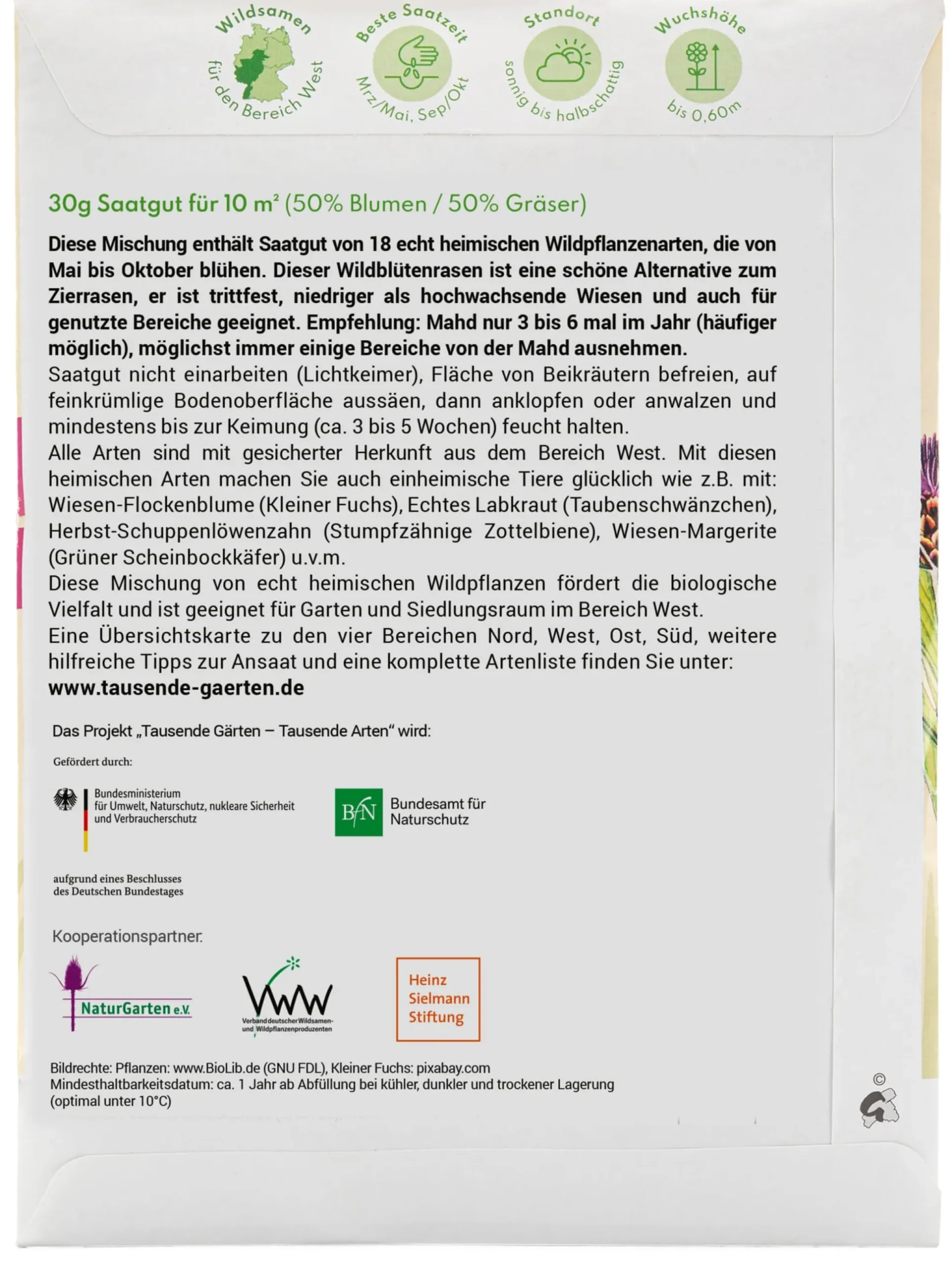 Für einen blühenden Rasen: 30 g Saatgut von Wildblumen (50%) und Gräsern (50%). Enthalten sind je nach Region etwa 18 bis 32 echt heimische Wildpflanzenarten. Mit den ersten Blüten ist im zweiten Jahr nach der Aussaat zu rechnen, die Blütezeit erstreckt sich von Mai bis Oktober. Ausreichend für eine Fläche von 10 qm. Aussaat- und Pflegeanleitung auf der Verpackung.