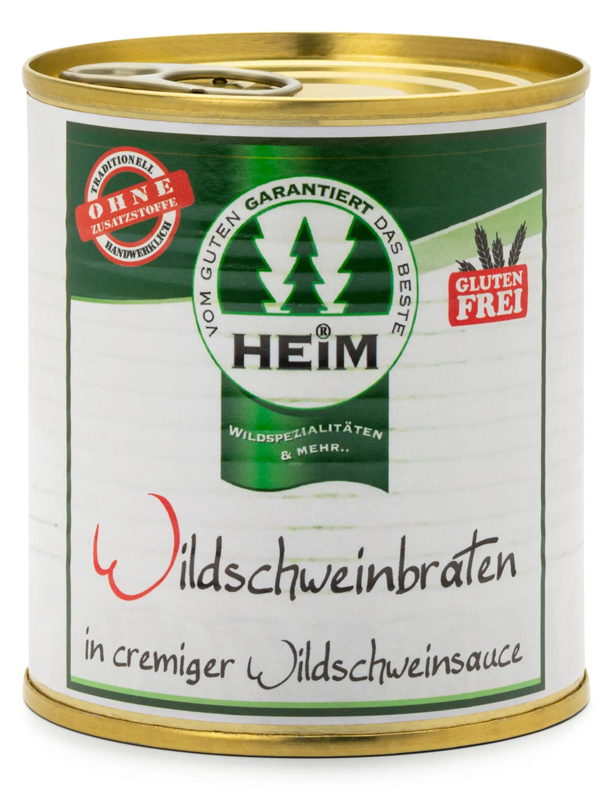 Wildschweinbraten in Scheiben enthält diese Dose. Der beim Anbraten gewonnene Fleischsaft bildet neben den angerösteten Wildknochen die Basis für die feine, cremige Sauce. Erlesene Wildgewürze und Crème fraîche runden den milden und zugleich wildtypischen Geschmack dieser Spezialität ab.