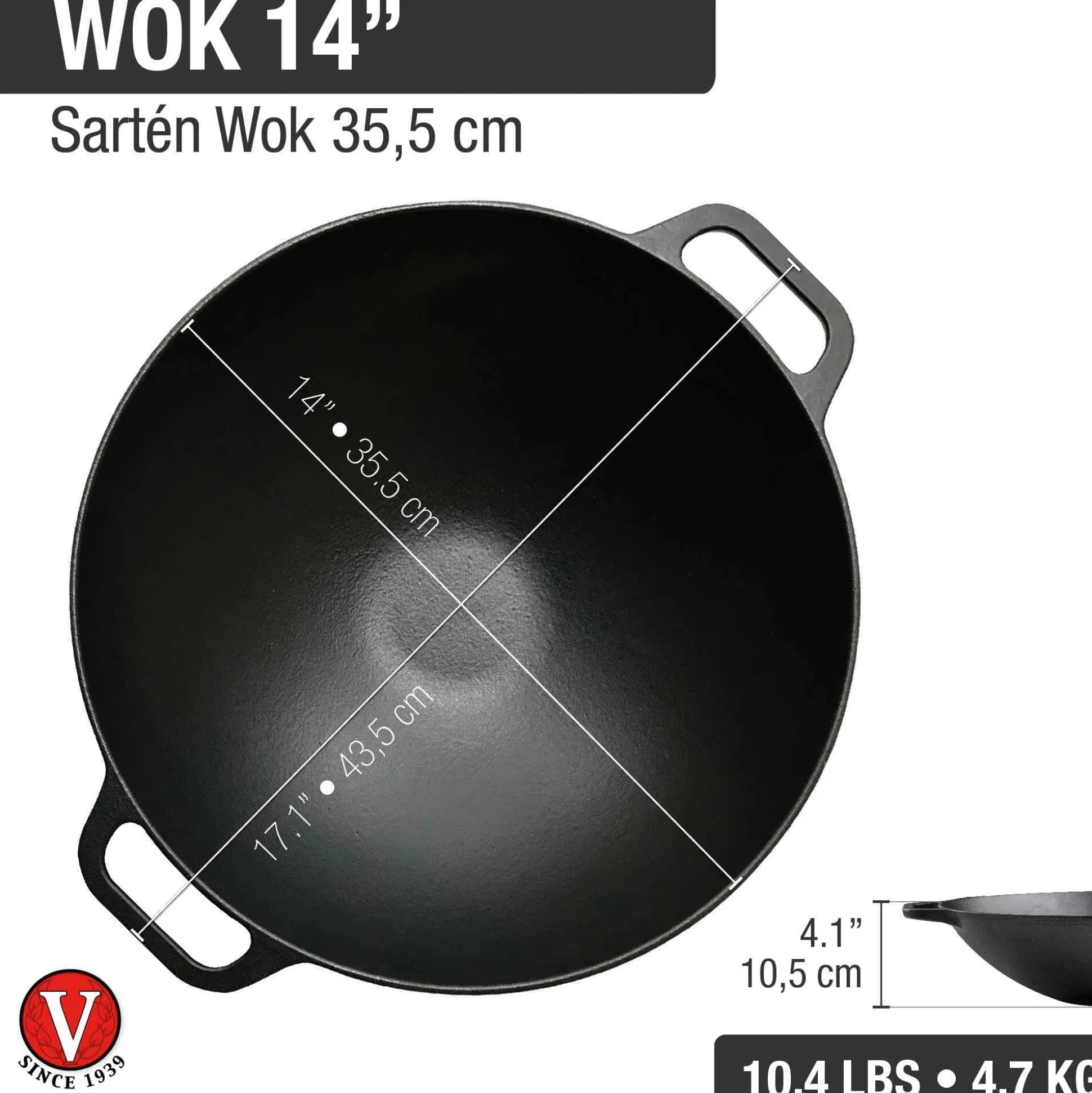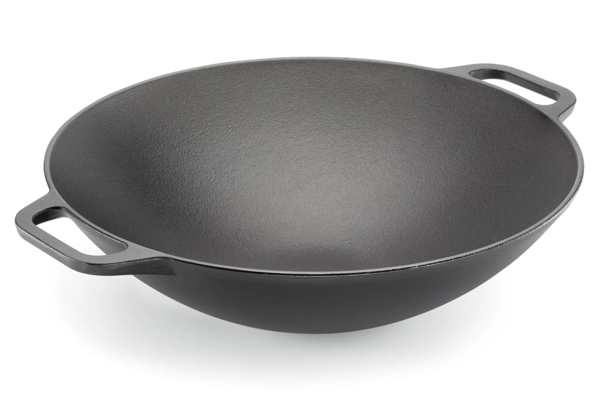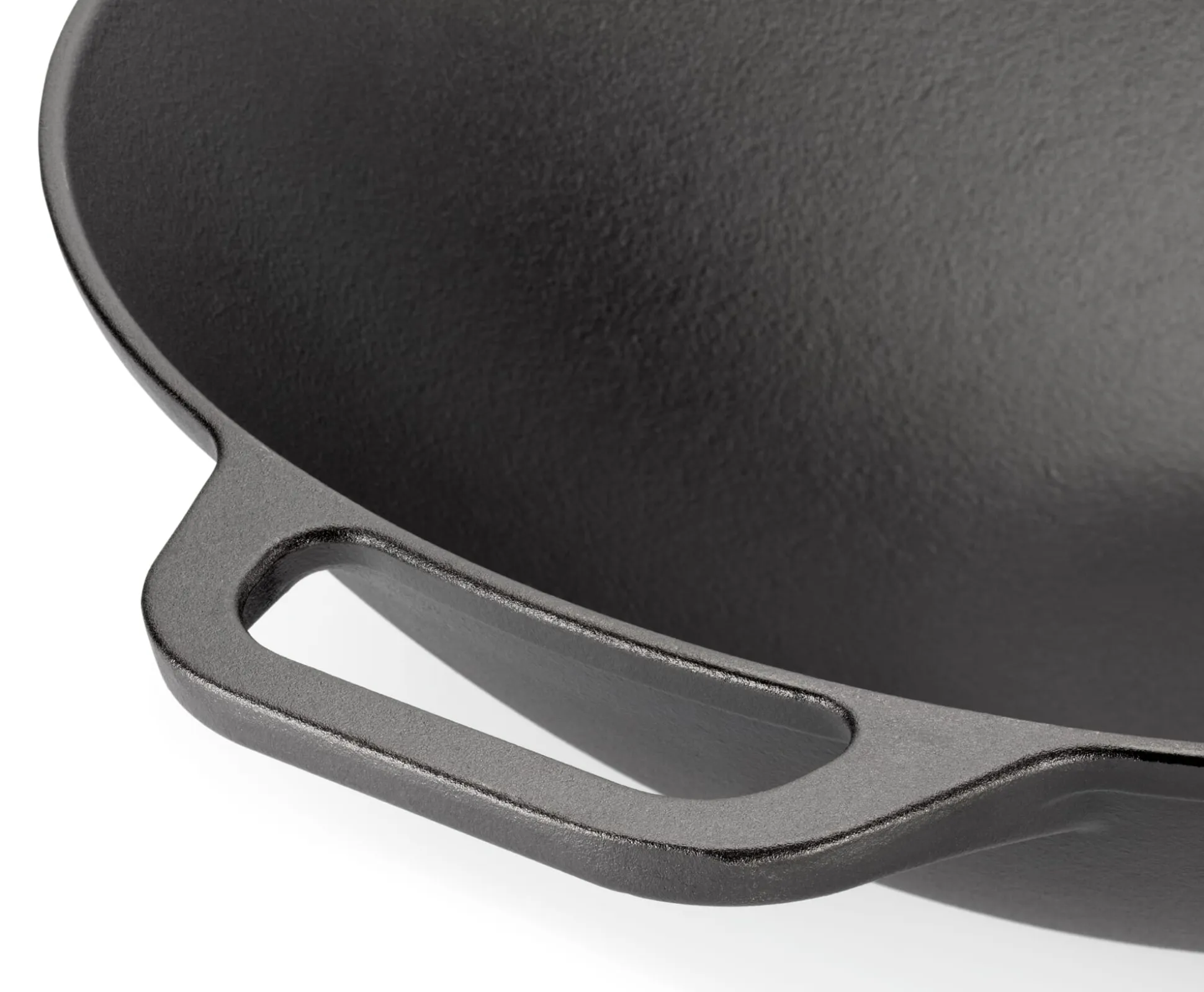 Wie für (fast) jedes andere Material gilt auch für Gusseisen: je massiver, desto ausgeglichener die Reaktion auf Wärmezufuhr. Das betrifft die Verteilung genauso wie das Speichern von Wärme. Gusseisen gibt, wenn Sie so wollen, ein hervorragendes Speichermedium ab und ist daher für Anwendungszwecke wie diesen ideal geeignet – denn beim Garen von Gemüse, Fleisch und Ei im Wok kommt es schließlich genau auf diese beiden Dinge an: dass die zugeführte Wärme vom Boden bis an den oberen Rand des Kochgefäßes gleichmäßig verteilt wird, und dass das Gefäß während der gesamten Dauer des Garvorganges rundherum warm, wenn nicht sogar heiß, bleibt. Die bestgeeignete Wärmequelle ist der Gasherd, Sie können unseren gusseisernen Wok aber auch auf E-Herd oder Grill einsetzen. So groß und schwer wie er ist, eignet er sich perfekt fürs Kochen mit (oder für) Besuch. Unser Tipp: Probieren Sie doch mal ein cremig gerührtes Risotto vom Grill!