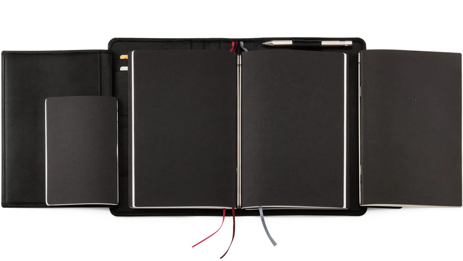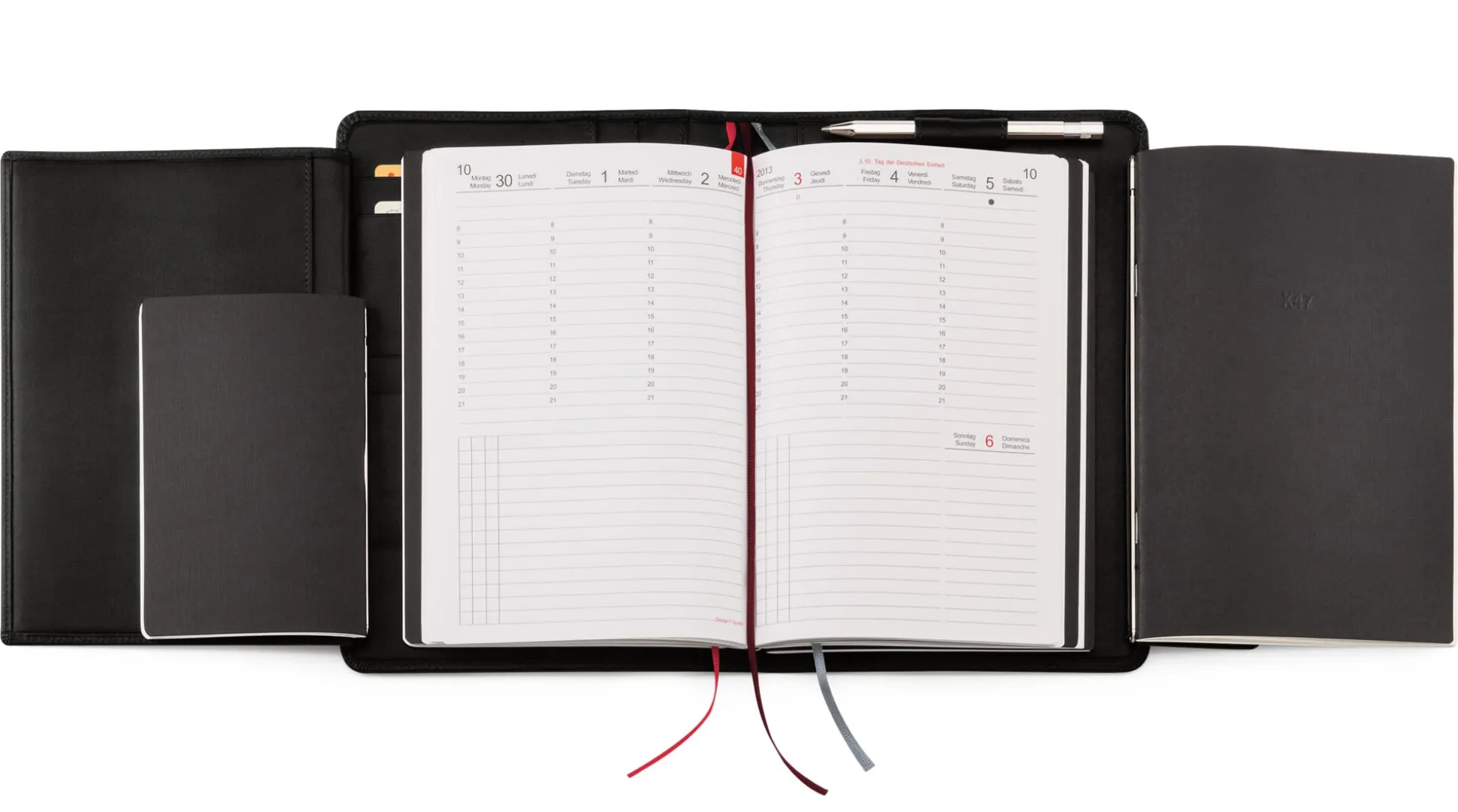 Das X47-Organisationssystem des ehemaligen Unternehmensberaters Matthias Büttner ist ganz handgreiflich aus der termingefüllten und kontaktfreudigen Berufspraxis Büttners entstanden und schnell zu einem durchdachten System von Möglichkeiten und Kombinationen gewachsen. Termine, Adressen, Notizen etc. finden in einzelnen Heften Platz, die mittels einer Stange in Federschienen im Rückenfalz der ledernen Hülle befestigt werden können.