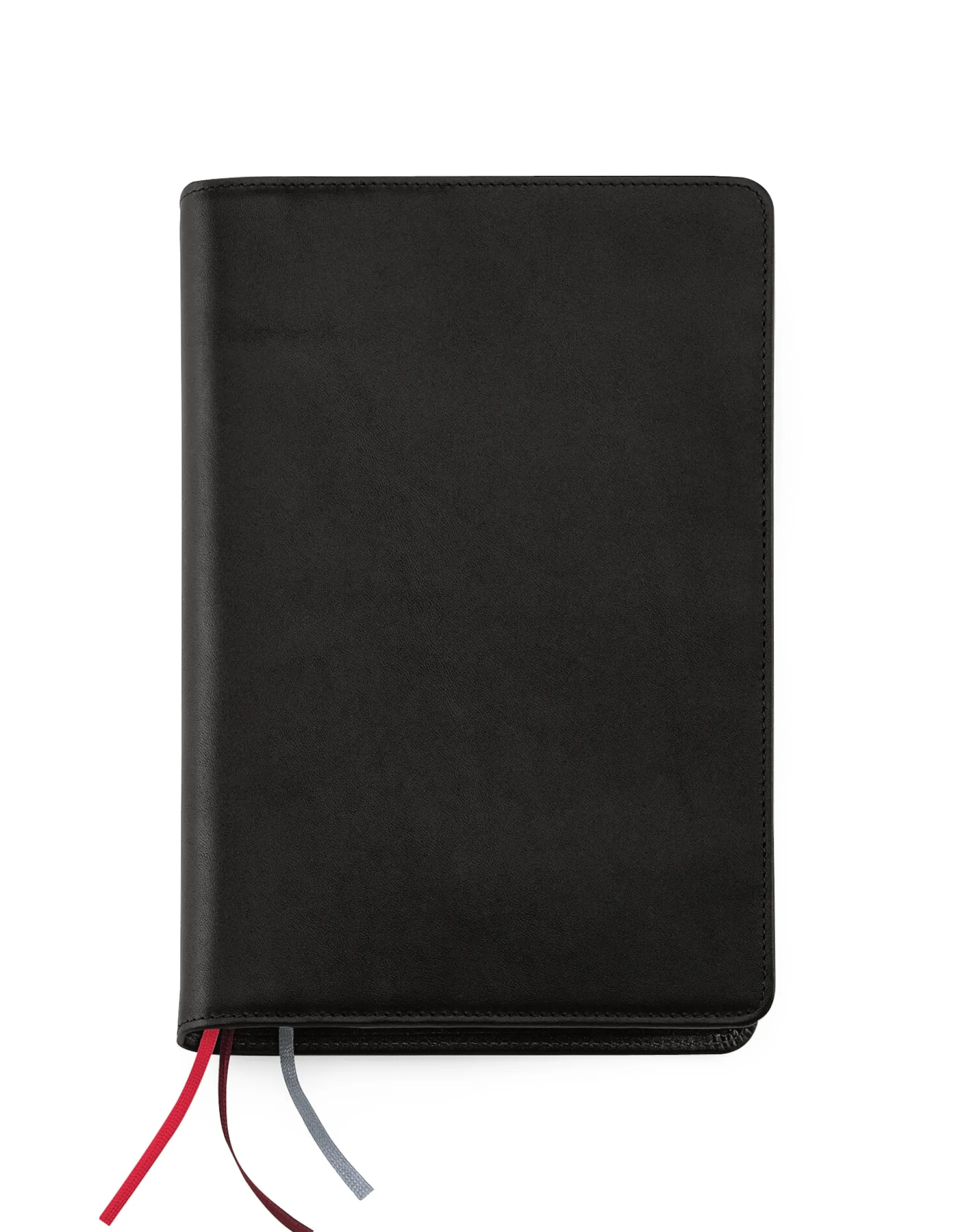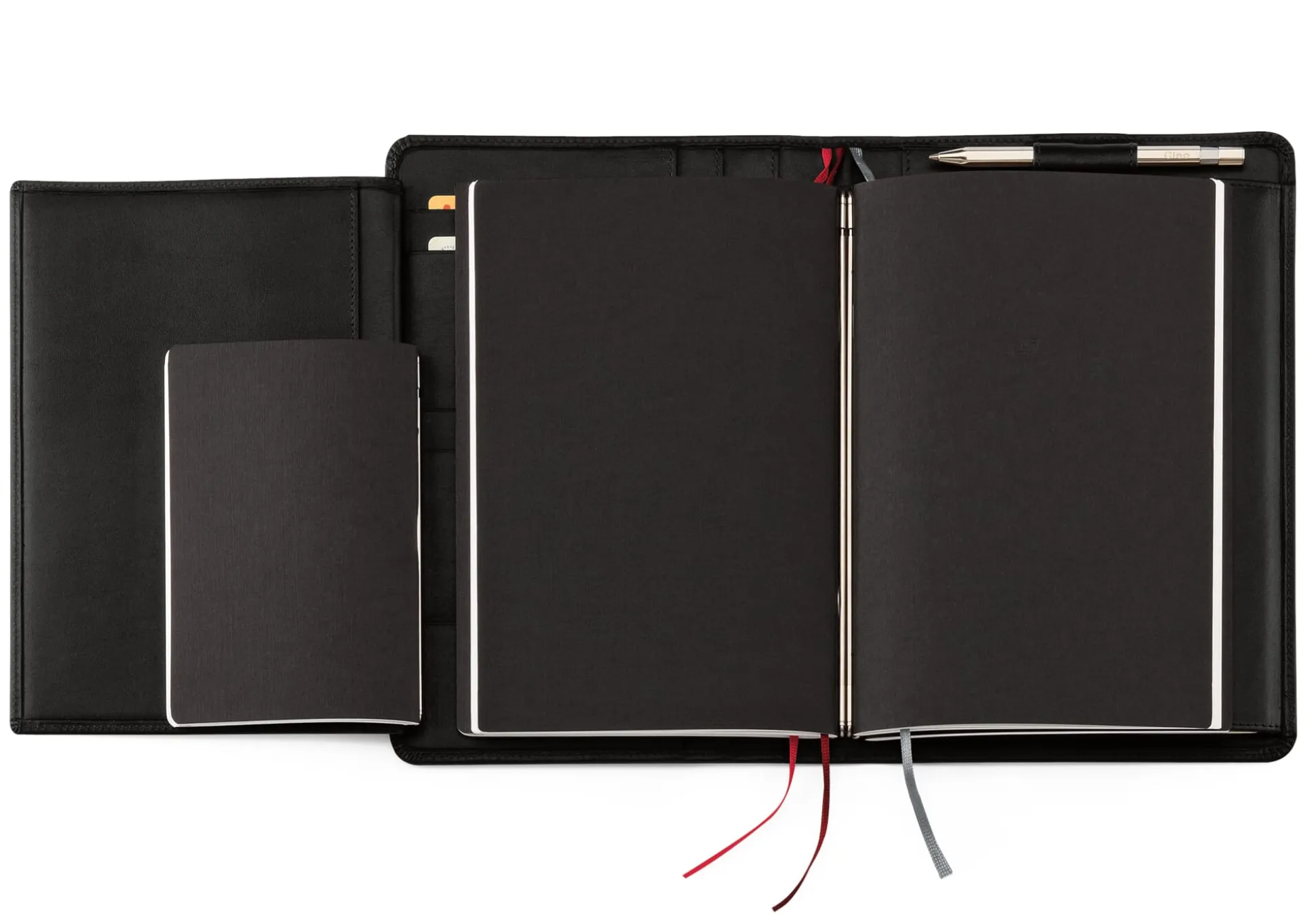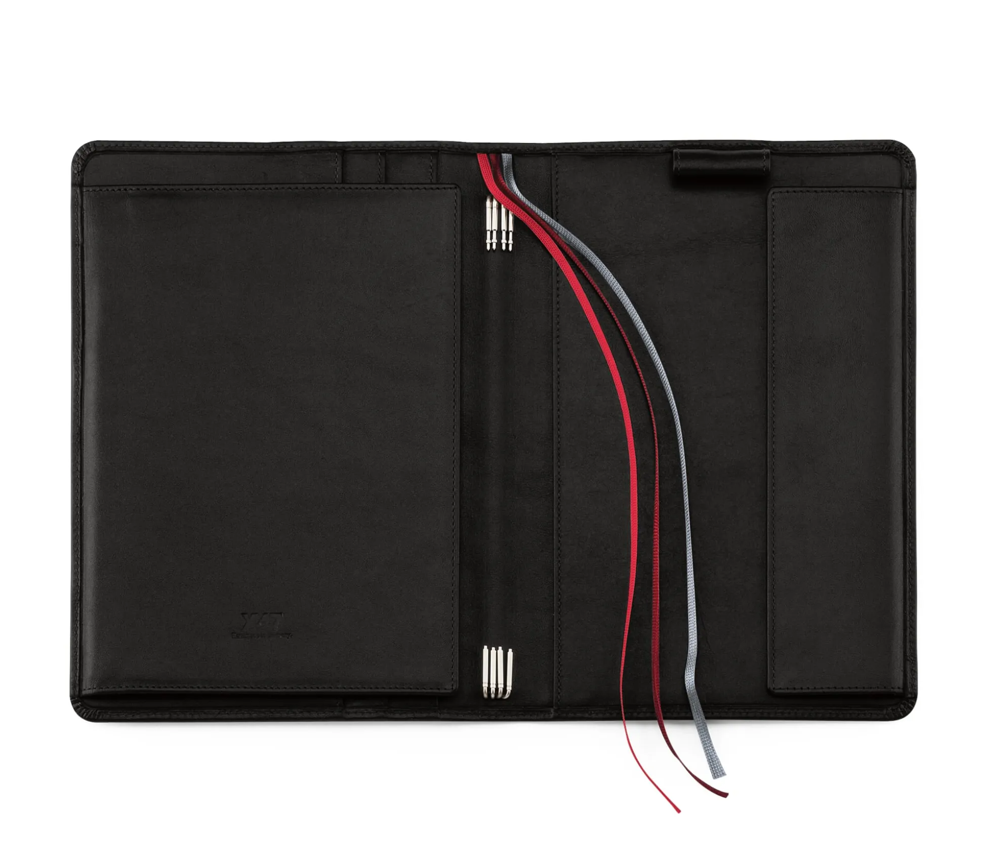 Für 5 Einlagen des Formats A5 (mittig und rechts) und eine des Formats A6 (links). Aus feintäschnerisch verarbeitetem Rindleder. Mit 4 Einsteckfächern für A5- bzw. einmal gefaltete A4-Formate, einem etwas kleineren Einsteckfach, 5 Taschen für Kredit-, Dauer- und Visitenkarten, mit 3 Zeichenbändern in unterschiedlichen Farben und einer Stiftschlaufe für schlanke Schreibgeräte bis zu einer Länge von 15 cm.