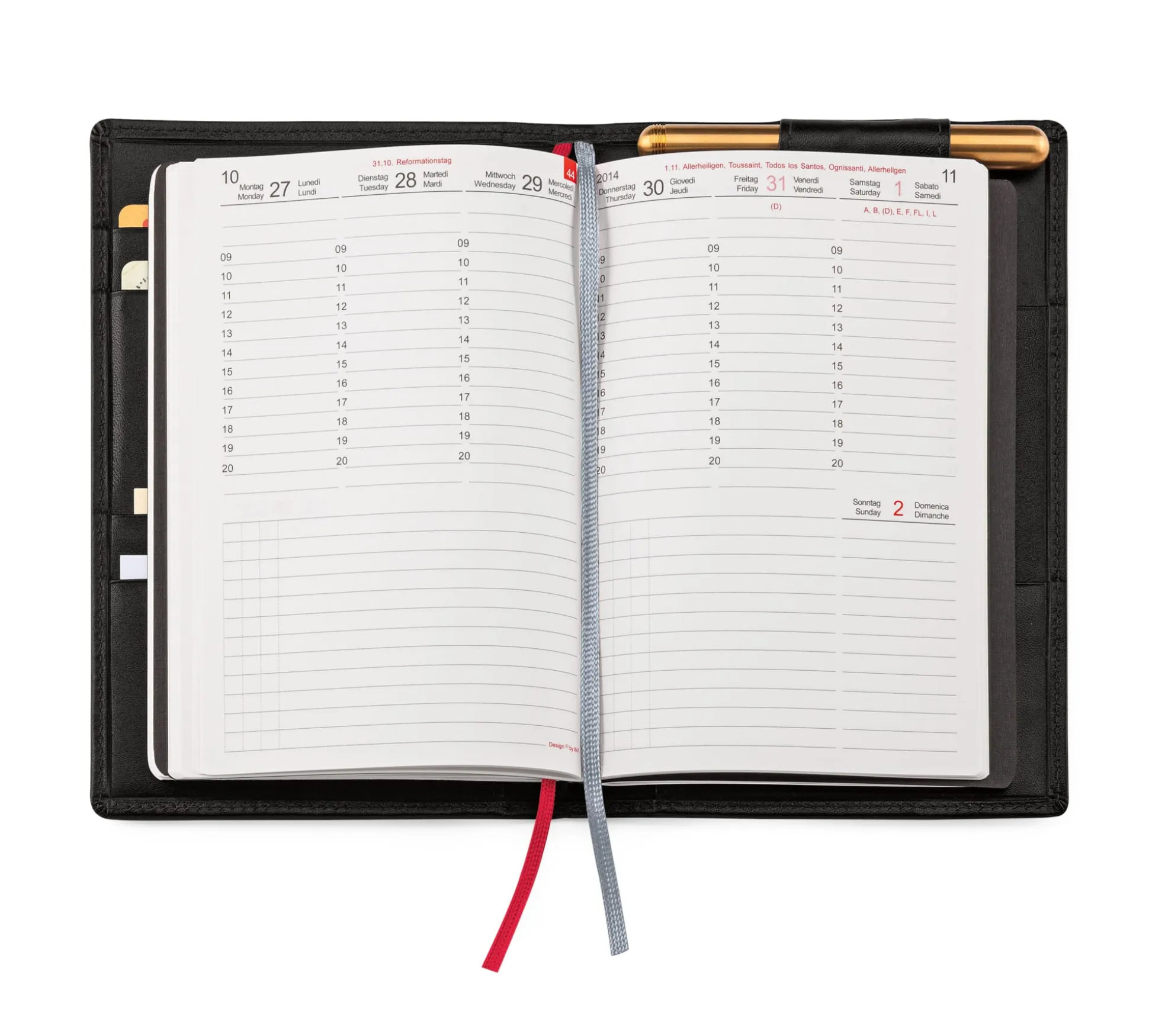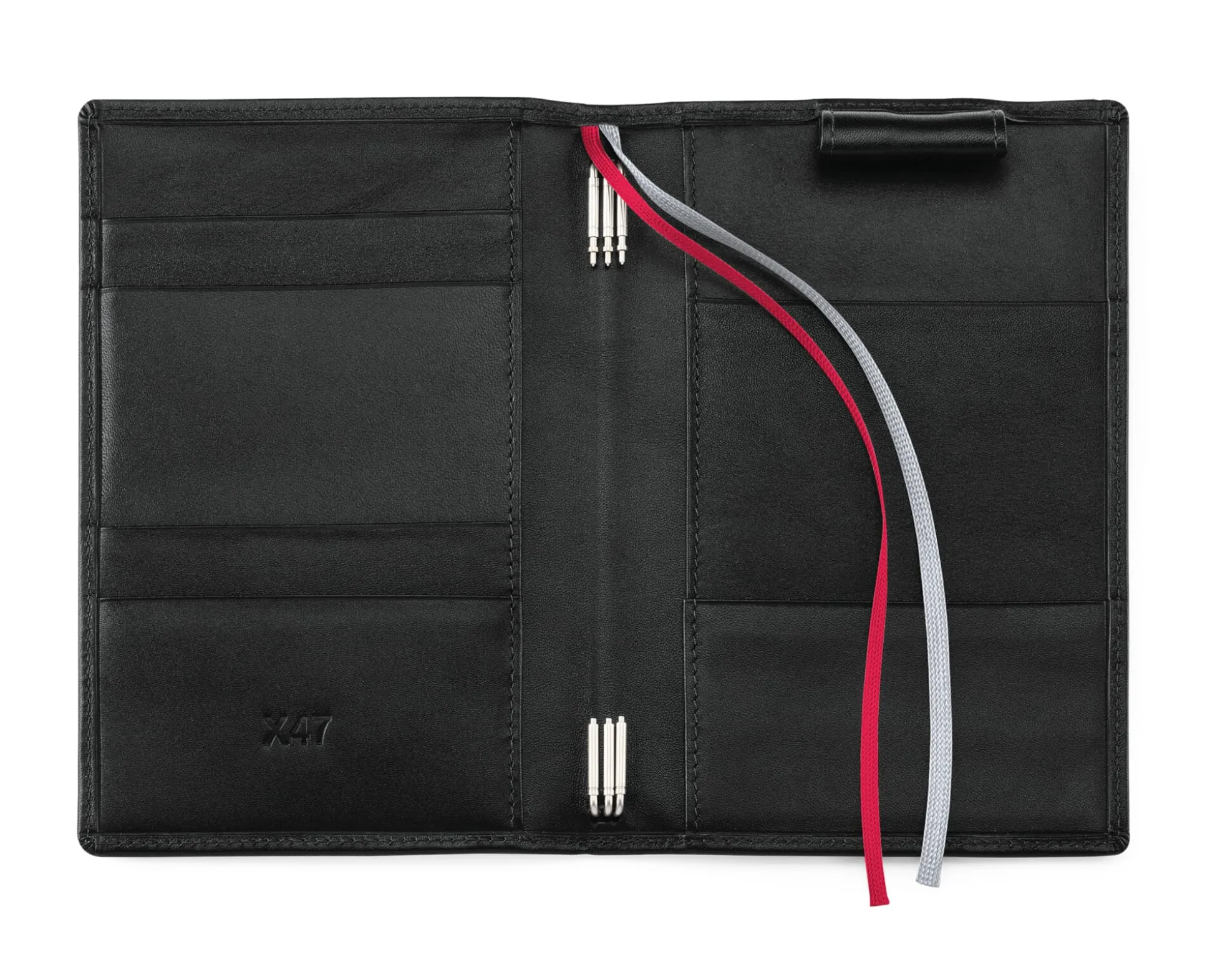 Dieses X47-Organisationssystem fasst lediglich drei A6-Einlagen und bleibt somit nicht nur wegen des kleinen Formats jackentaschentauglich, sondern auch im Umfang schlank. Ansonsten ist es wie die größeren Varianten aus feinem Rindleder gearbeitet. In zwei Steckfächern lassen sich Notizzettel unterbringen, fünf kleinere Fächer nehmen Kreditkarten auf. Zwei verschiedenfarbige Zeichenbänder dienen als Lesezeichen und eine Schlaufe nimmt einen schlanken Stift bis 10 cm Länge auf.
