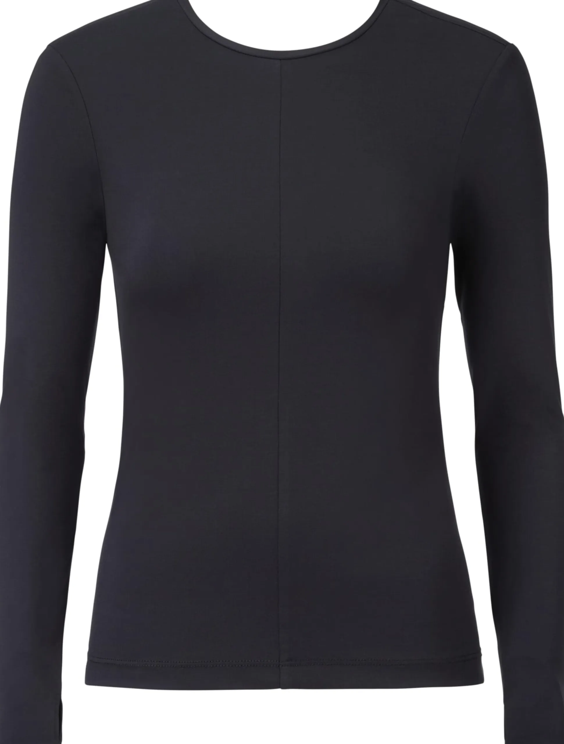 Das Langarm-Top ist körpernah geschnitten und lässt sich solo zum Trainieren, aber auch zum Drunterziehen gut tragen. Dabei liegt der schmiegsam-weiche, elastische Jersey angenehm auf der Haut, er besteht aus 78 Prozent Modal und 22 Prozent Elastan, was hohen Tragekomfort garantiert. Vorder- und Rückenteil sind mit einer Teilungsnaht gearbeit, Ärmelsäume und V-Ausschnitt sind sorgfältig paspeliert. Besonders interessant: Der V-Ausschnitt befindet sich im Rückenteil. Und besonders angenehm: Die Ärmel sind länger geschnitten und mit einer Daumenschlaufe gearbeitet, sodass sie nicht verrutschen, wenn es mal kühler ist. Das Top kann zu Sport-Pants und Leggings ebenso gut getragen werden wie zum Rock oder zur Jeans. Wenn Sie es etwas weiter tragen möchten, bestellen Sie es eine oder zwei Nummern größer.