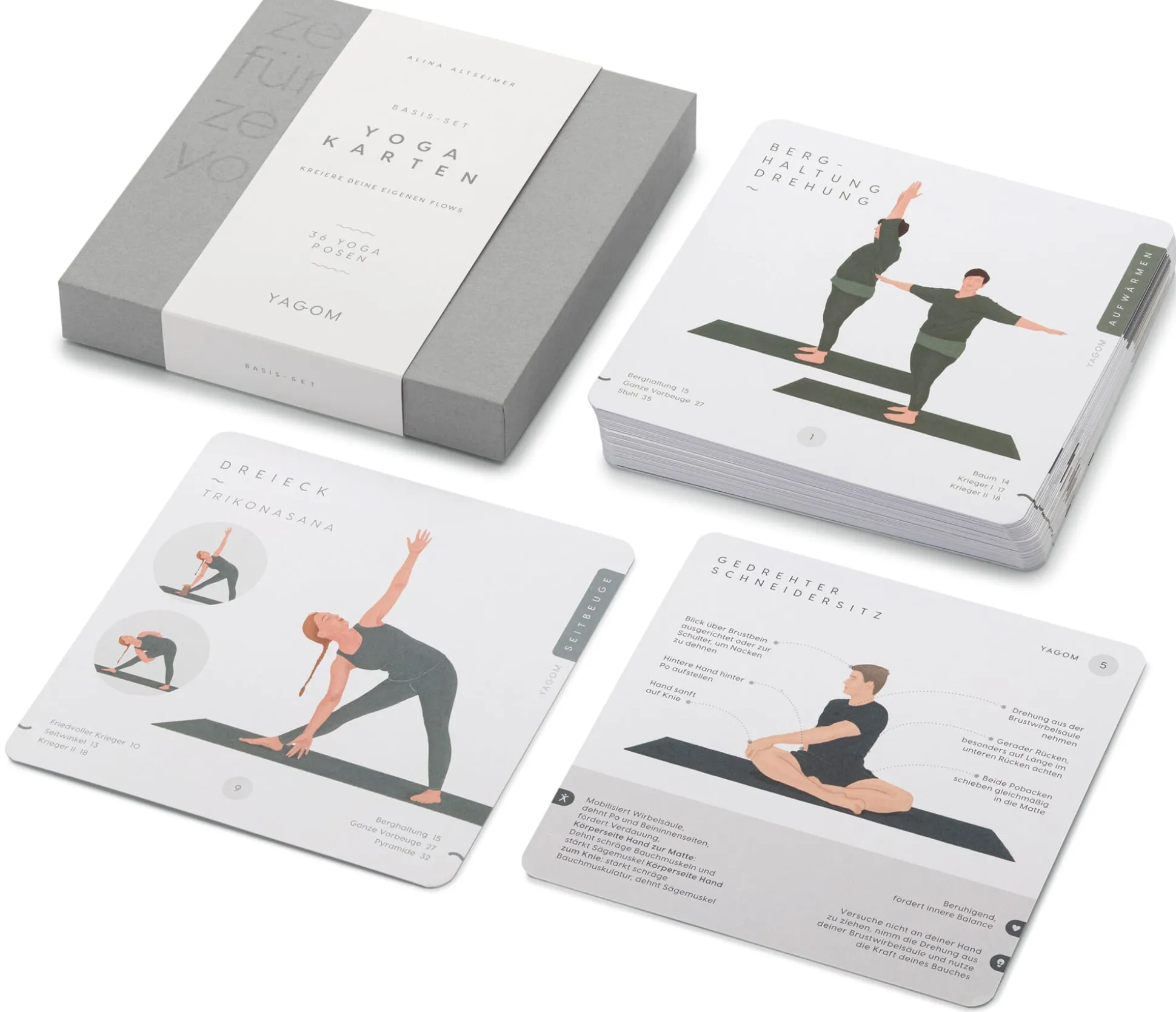 Das Basis-Set umfasst 36 grundlegende Yogapositionen, um den gesamten Köper zu kräftigen und zu dehnen. Das Yogakarten-Set für Rücken und Hüfte enthält überwiegend Asanas, die den Rücken stärken und die Hüftmuskulatur dehnen. Sie können die Sets unabhängig voneinander nutzen und auch miteinander kombinieren.