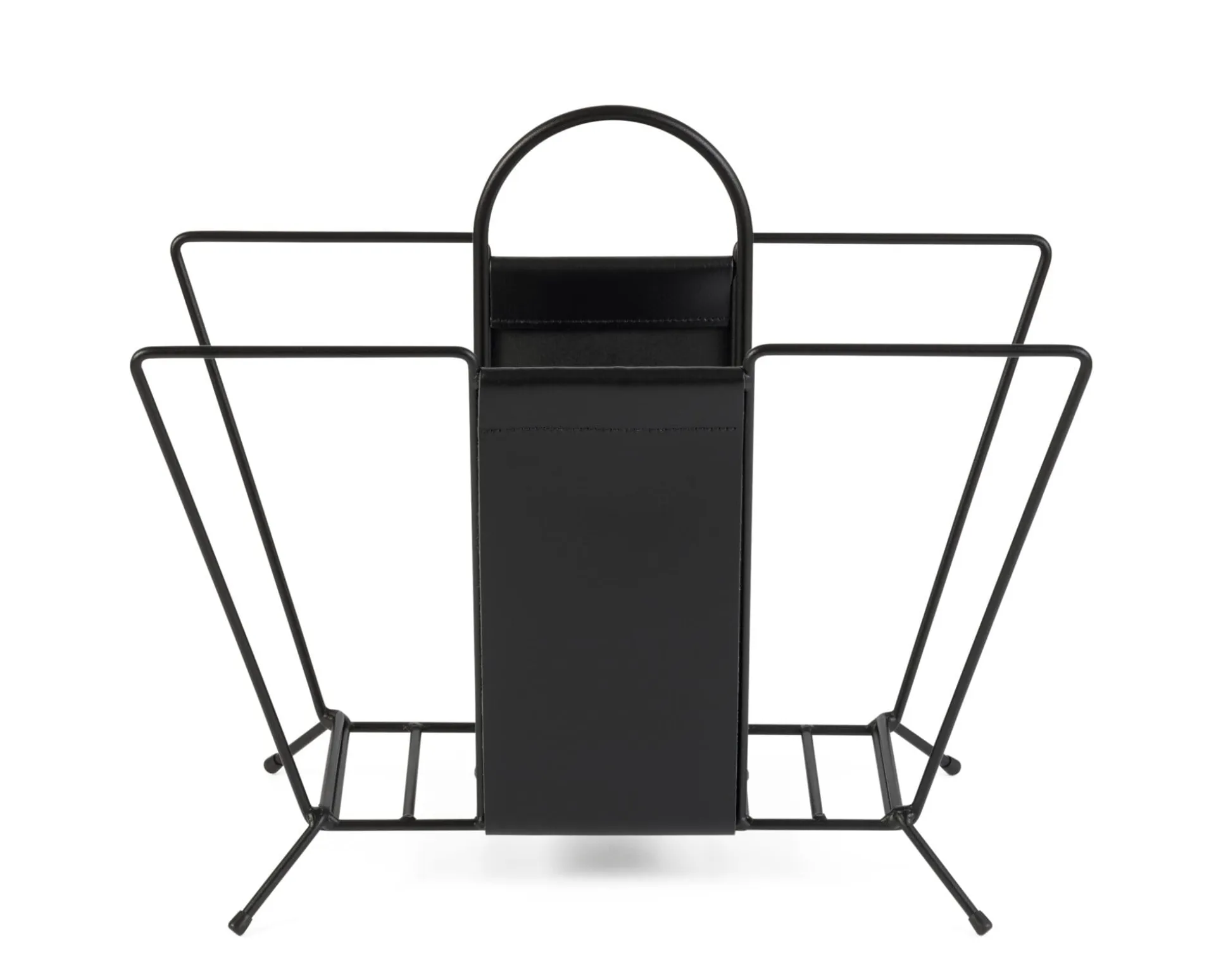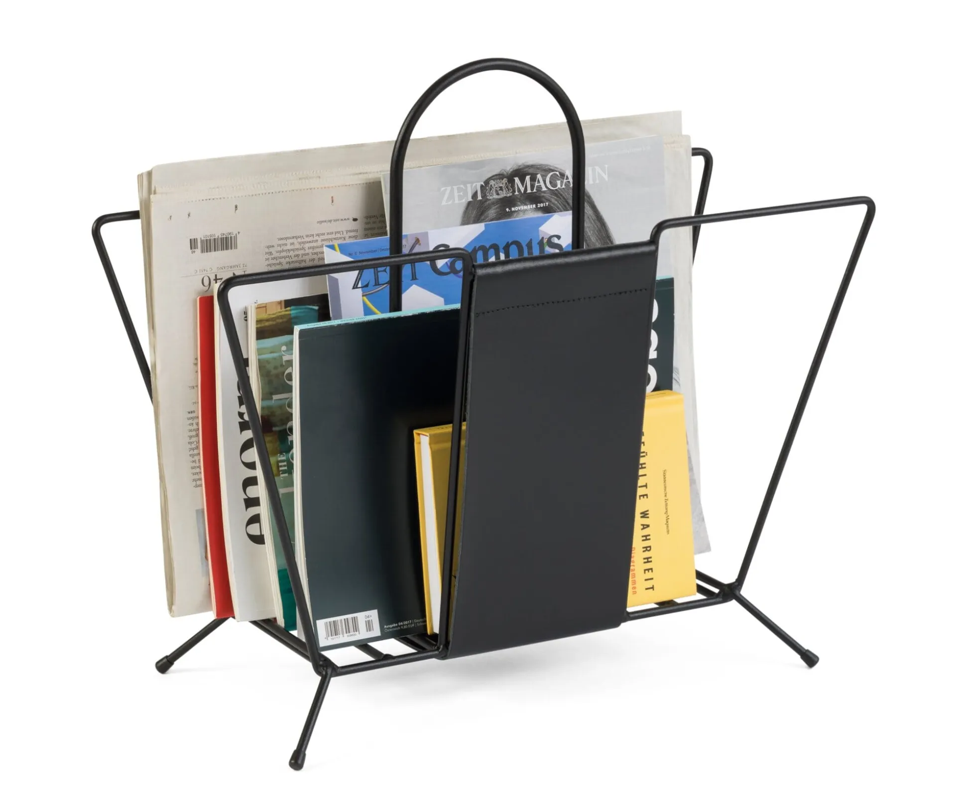 In der Mitte wird der Zeitungsständer durch einen hohen Bügel geteilt, der auch als Tragegriff dient. Aus Stahldraht, schwarz pulverbeschichtet. Mit einem Einsatz aus vegetabil gegerbtem braunem bzw. schwarz durchgefärbtem Vachettenleder. Füße mit Kunststoffkappen (LDPE). Höhe 32 cm, Breite 47 cm, Tiefe 21 cm. Gewicht 1,6 kg.