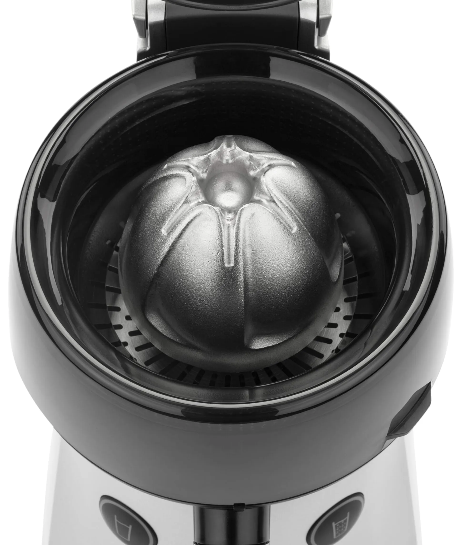 Das elegante Gehäuse der Zitruspresse ist aus Aluminiumdruckguss gemacht und außen mit einem säureresistenten Lack behandelt, um Korrosion durch Saftspritzer zu vermeiden. Der Aufsatz mit Presskegel, Zentrifuge und Schutzring kann zur Reinigung im Ganzen abgenommen werden. Wir empfehlen, die Einzelteile gleich nach Gebrauch unter fließend Wasser (nicht in der Maschine!) zu spülen. So haften die Reste der Fruchtfasern nicht an.