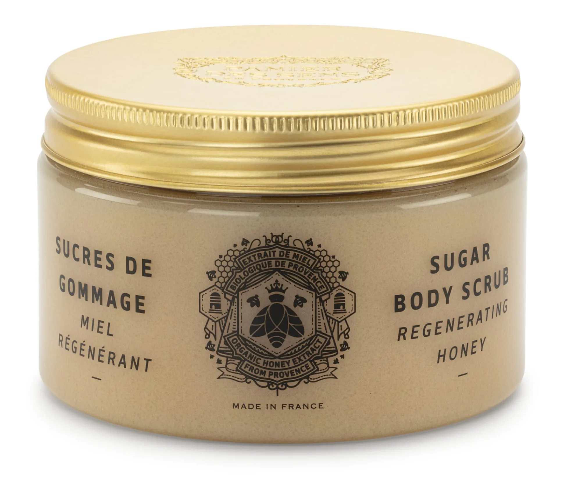 Körperpeeling mit Zuckerkristallen, Honig, Sheabutter und Mandelöl. Hergestellt in Frankreich.