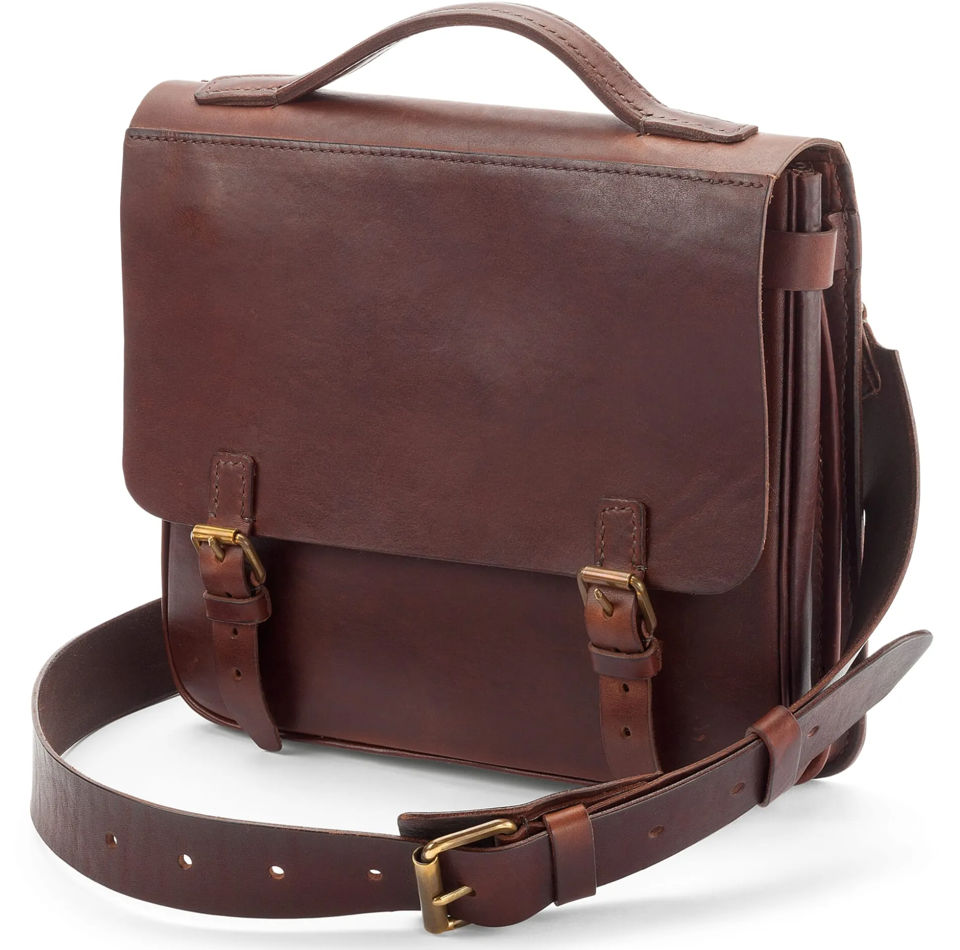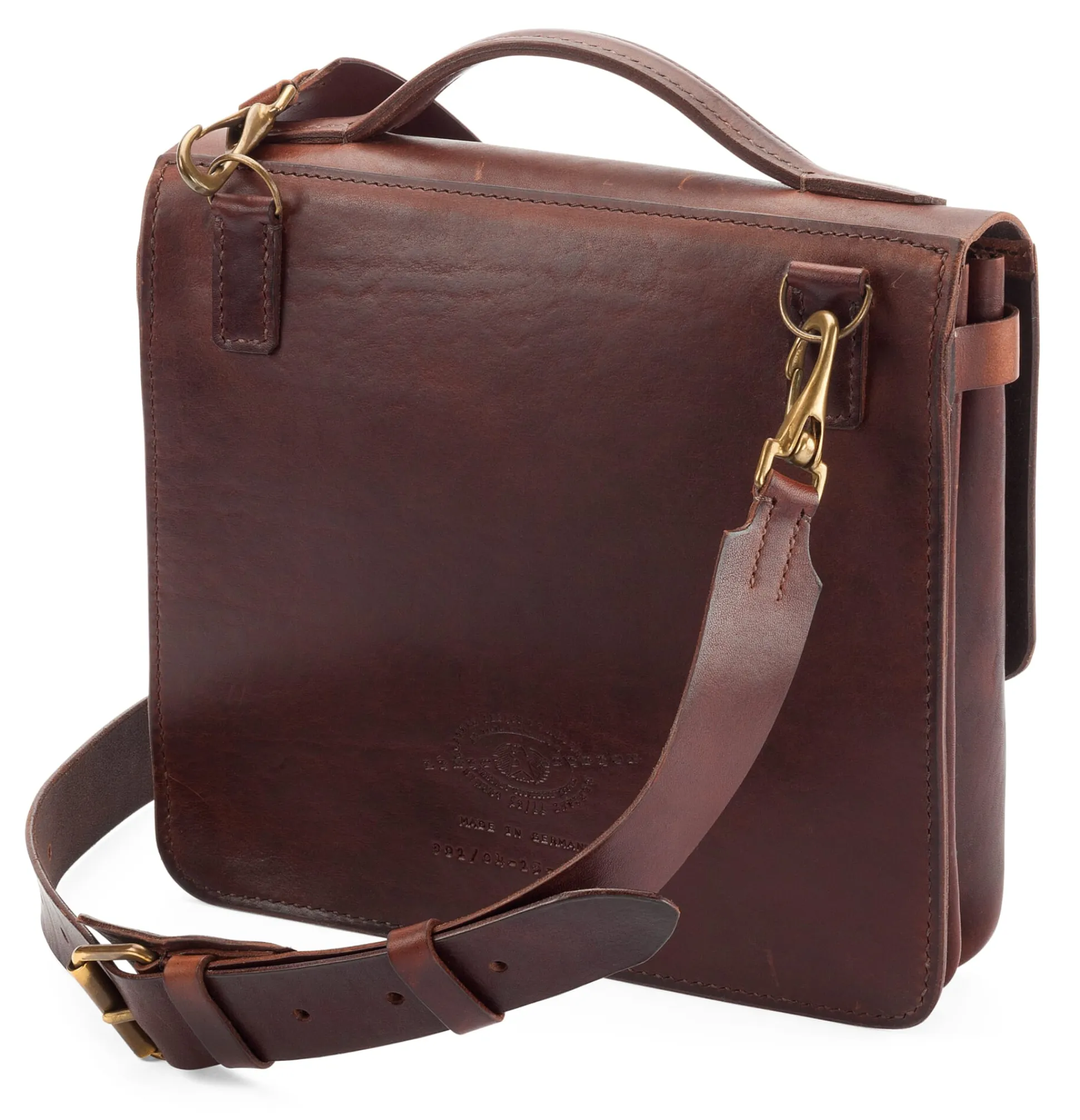 Dem klassischen Schulranzen ist diese handgefertigte Umhängetasche nachempfunden – doch ihre Lebensdauer wird wohl weit über i-Männchen-Zeit, Abschlussball und Professorenhut hinausgehen. Bis ins Detail ist sie auf Haltbarkeit gearbeitet. Das von Hand zugeschnittene stabile Rindleder – in einer Stärke von 3 mm – ist mit einem Sattlerstich vernäht. Das ohnehin sehr feste Garn wird dabei mit Bienenwachs bestrichen, sodass es zusätzlich mit dem Leder verklebt. In die lederne Flatterwand, die Struktur schaffend das Innenfach unterteilt, ist ein Reißverschlussfach integriert, dieweil weitere Fächer zugriffsbereiten Platz für Kleinteiliges bieten.