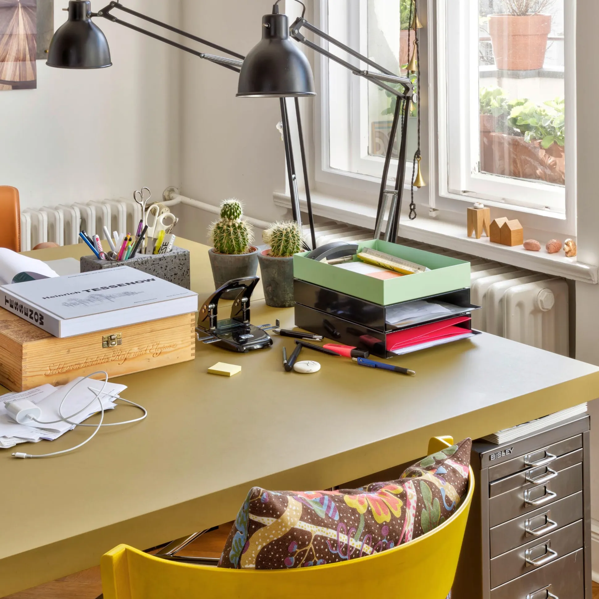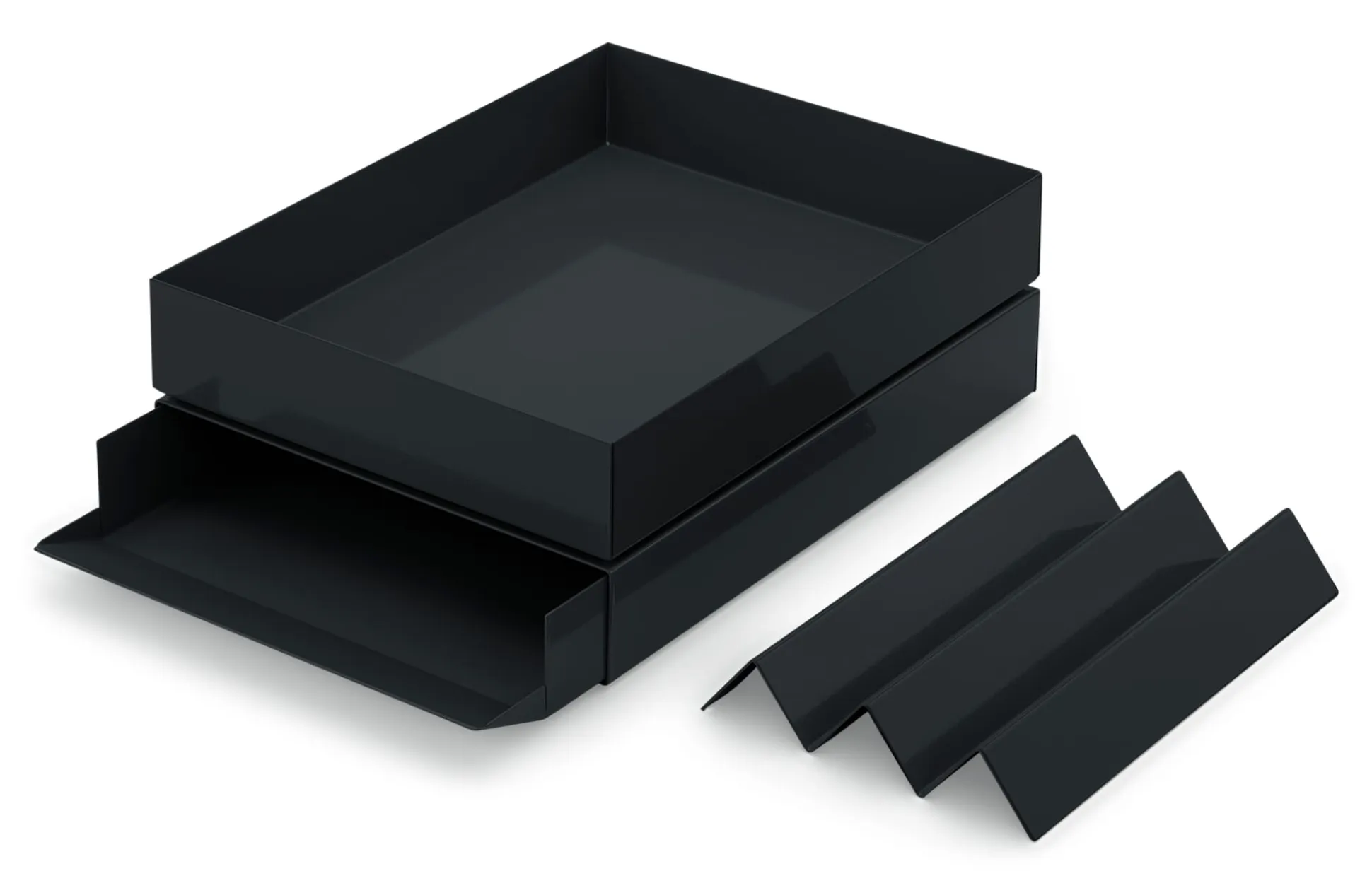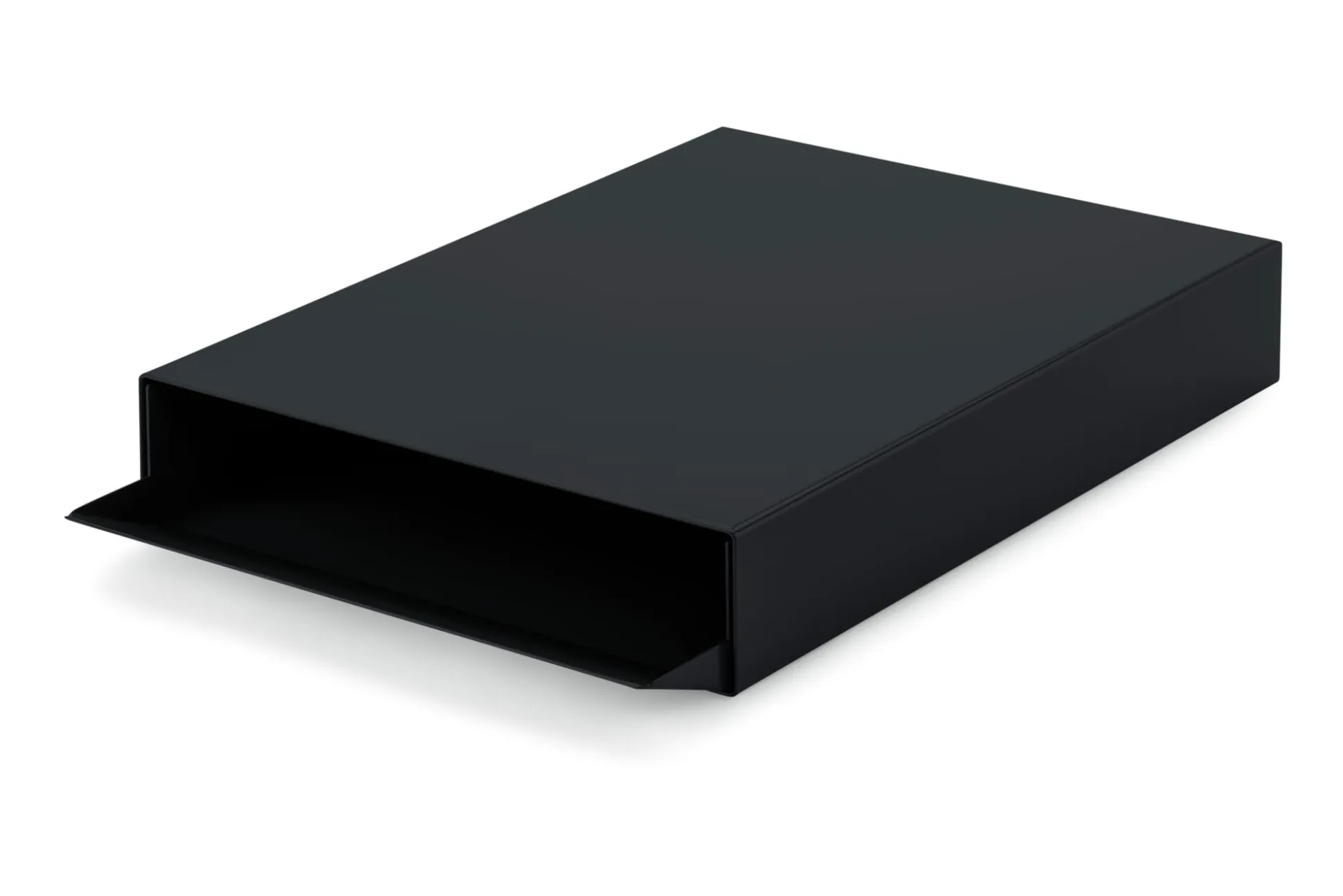 Nach einem Entwurf des Designerduos Christoph Gerdesmeyer und Jonas Krohn: formschöne zweiteilige Papierablagen aus gefaltetem Stahl. Die innere Form, wie ein Einschub im Innenteil zu bewegen, besitzt eine leicht aufgeformte und hochgestellte Vorderkante, die sich symbolhaft als Einwurf für maximal DIN-A4-große Formate anbietet. Die äußere Form umhüllt den Inhalt und ermöglicht die Stapelbarkeit einzelner STAPLER übereinander.