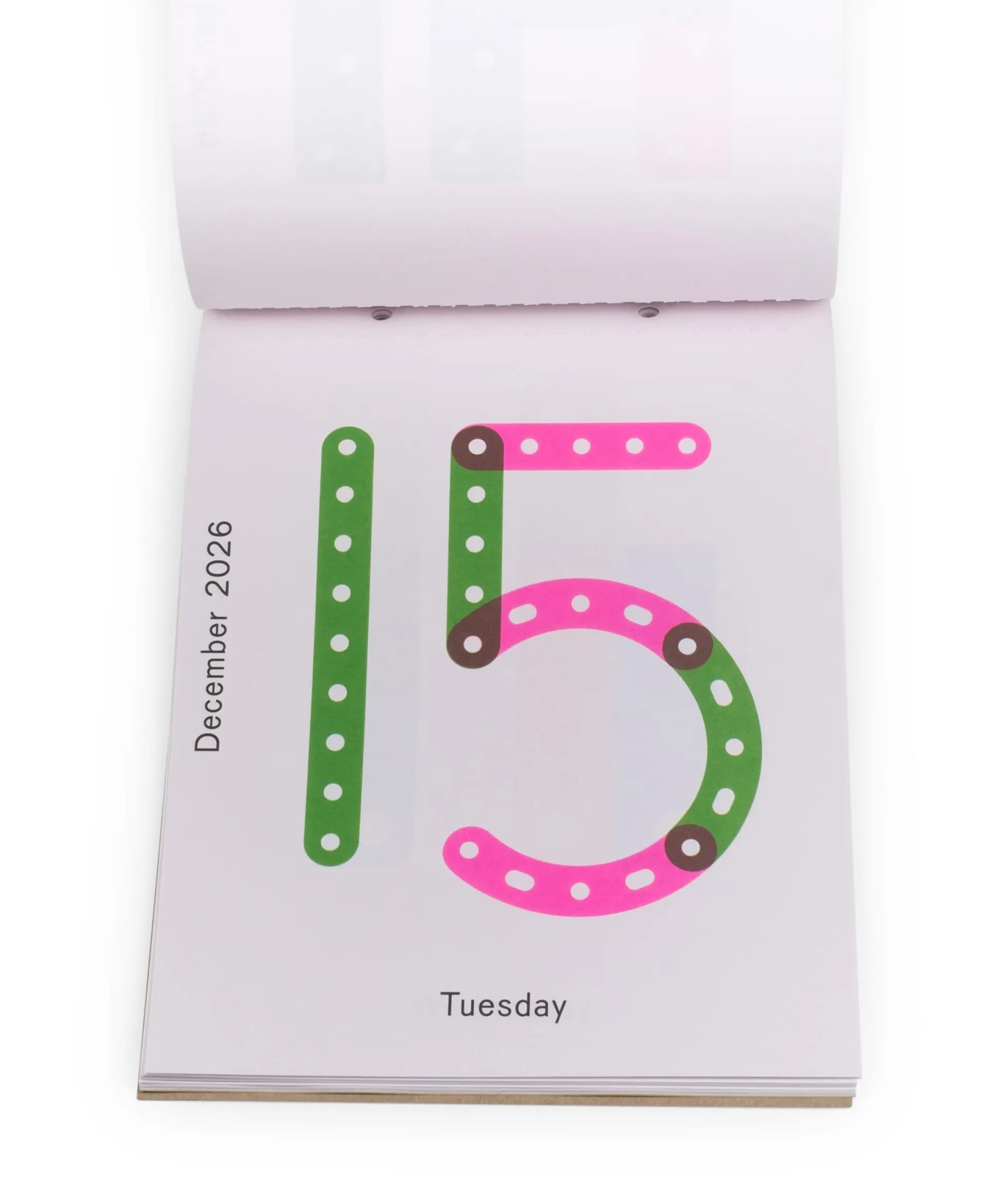 Farbstarke Grafik, die zählt: Tage nämlich. Die unkonventionellen und charaktervollen Ziffern dieses Abreißkalenders sind von Karel Martens gestaltet. Der niederländische Grafikdesigner (geb. 1939) ist seit vielen Jahrzehnten eine einflussreiche Größe der visuellen Kultur in den Niederlanden. Diese iterative Art des Druckens zeigt, wie kreative Prozesse vermeintliche disziplinäre Grenzen überschreiten. Für jedes Blatt des Abreißkalenders 2026 hat Martens eine originäre, abstrahierte Form geschaffen, die als Zahl dient. Der Verweis auf die tägliche Praxis der Kunst bringt Martens‘ eigenen Ansatz als Designer und Pädagoge zum Ausdruck: „Jeder Tag ist ein neuer Tag!“.