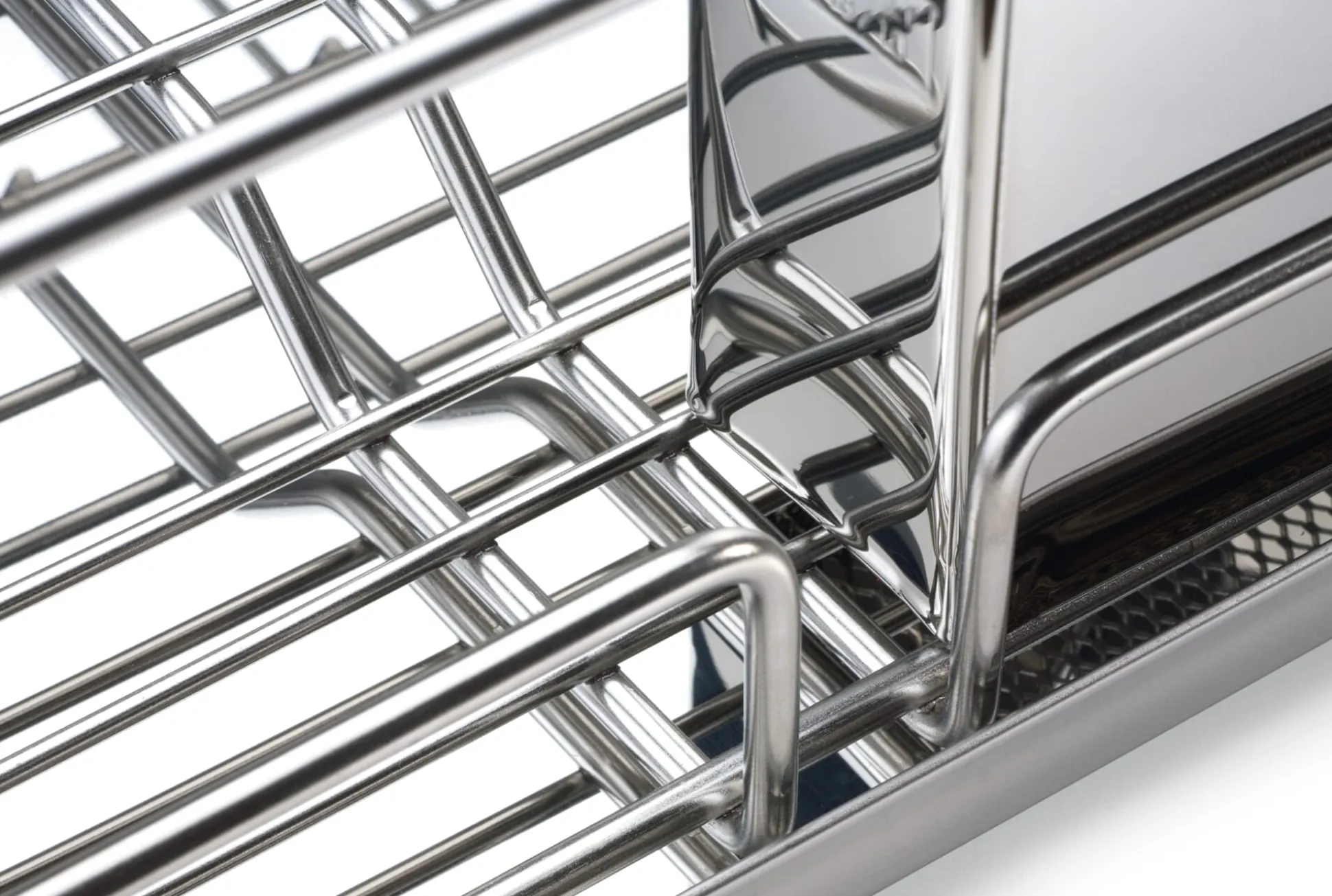 Dreiteiliges Abtropfgestell aus Edelstahl 18/10, bestehend aus Unterteil, Gitter und eingehängtem Besteckkasten. Lieferung ohne Teller und Besteck.