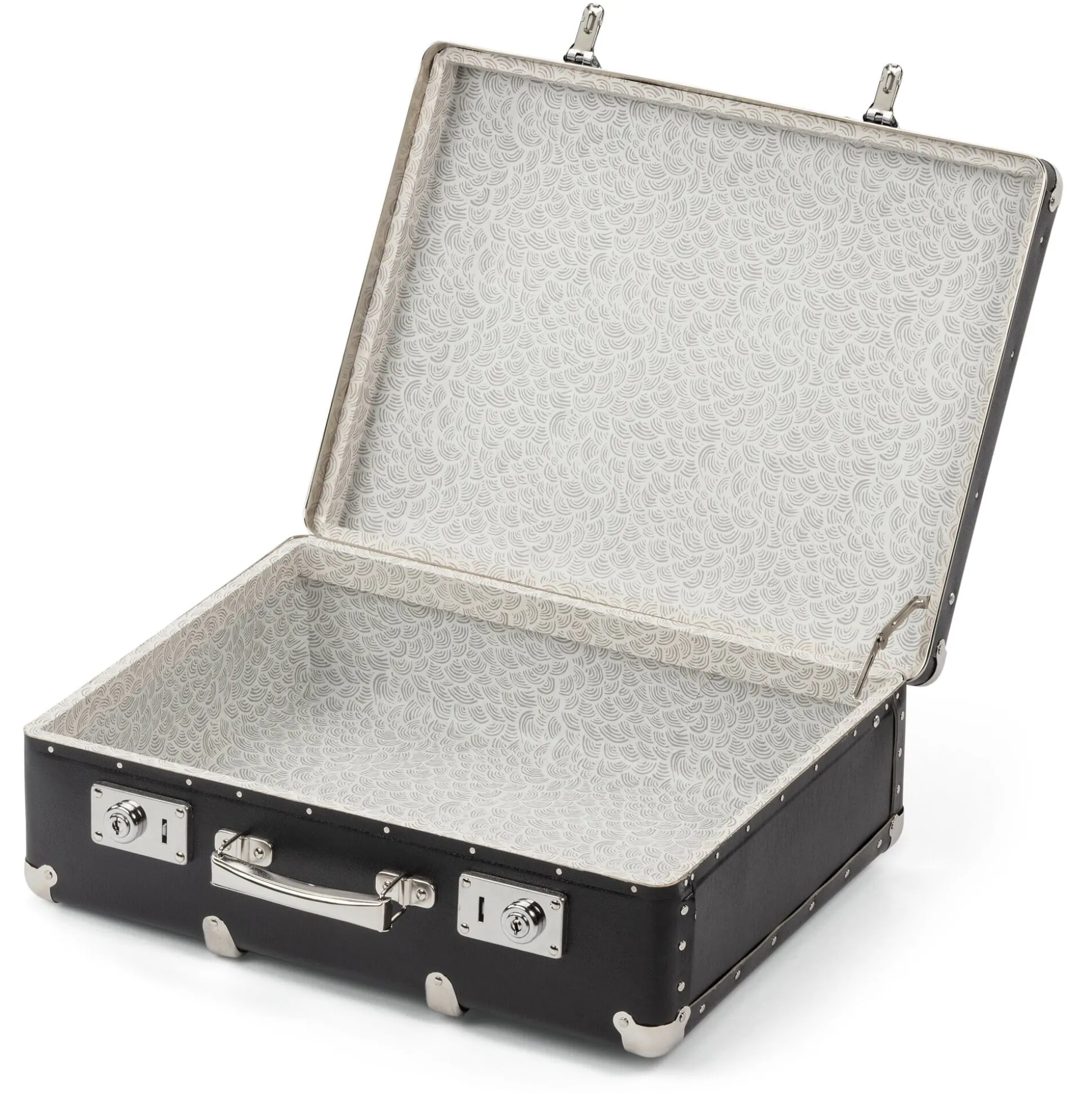 Hier kommt Pappe in einer ihrer klassischen Anwendungsgestalten, als Koffer nämlich. Die ernst zu nehmenden Koffer werden seit mehr als 80 Jahren von einem tschechischen Hersteller gefertigt, sie sind überzeugend stabil und zeichnen sich durch ihre Details aus: Ecken und Kanten werden aus der Pappe gebogen, die eingesetzten Seitenteile sind genietet; die Ecken sind außen ebenso wie die Ränder mit Stahlblech verstärkt; außen aufgesetzte Holzleisten und bei der größeren Ausführung massive hölzerne Leistenrahmen im Inneren gewährleisten Stabilität. Schlösser (bei den beiden größeren Koffern abschließbar), Beschläge und Griff ebenfalls aus Stahlblech, innen sind die Koffer mit Papier kaschiert.