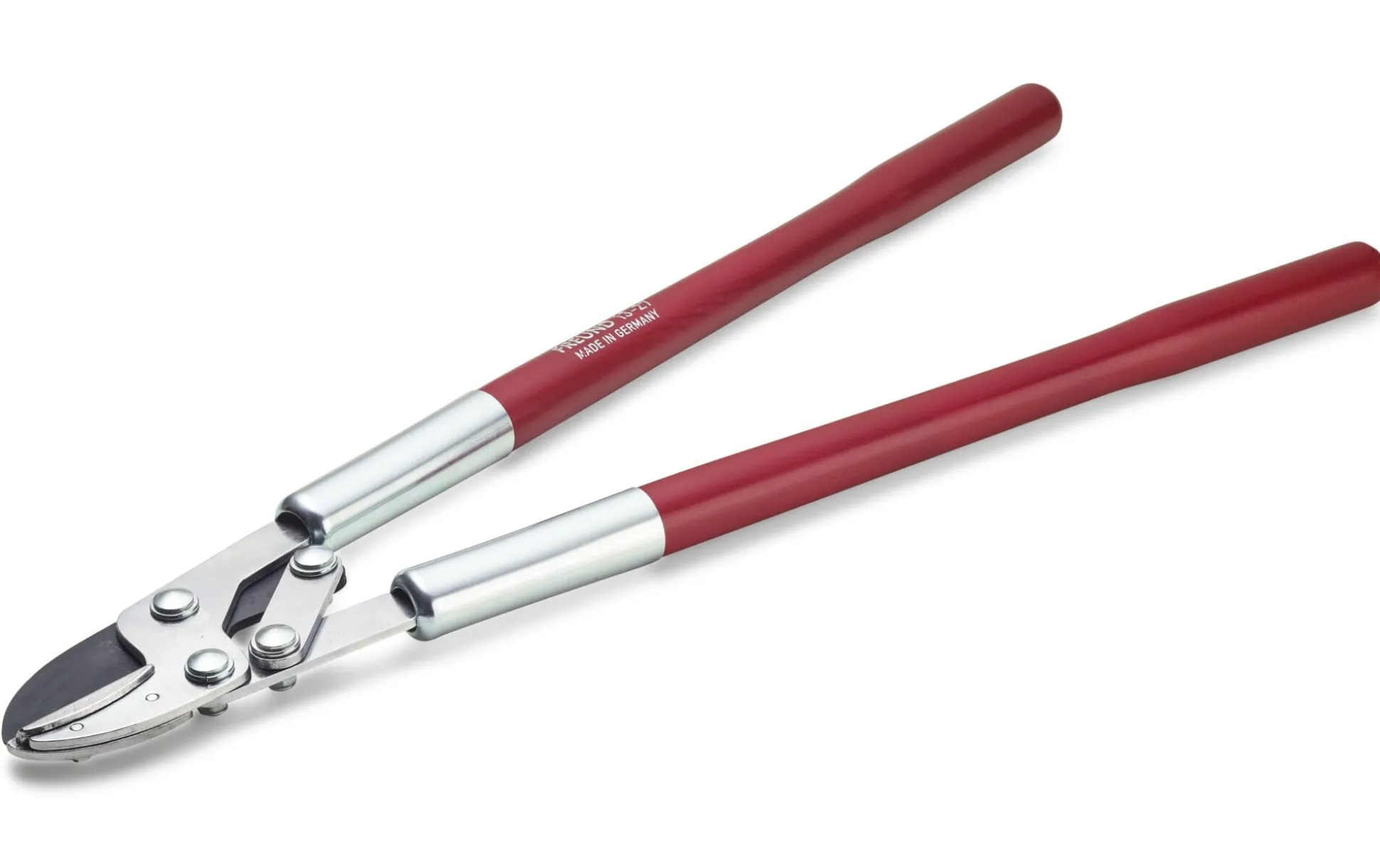 Diese Schere schneidet Äste bis zu einem Durchmesser von fünf Zentimetern. Es ist unser kräftigstes Modell, eine Ambossschere, die mit ihren langen Griffen aus Holz und der weit zu öffnenden Mechanik bei mancher Baumpflegearbeit „über Kopf“ und vor allem dem Auslichten vergreister Sträucher und Büsche gute Dienste leistet. Alte, harte oder dick gewachsene Äste bewältigt die Schere spielend. Der für diese Arbeiten nötige Kraftaufwand wird durch eine Doppelhebelübersetzung spürbar minimiert.