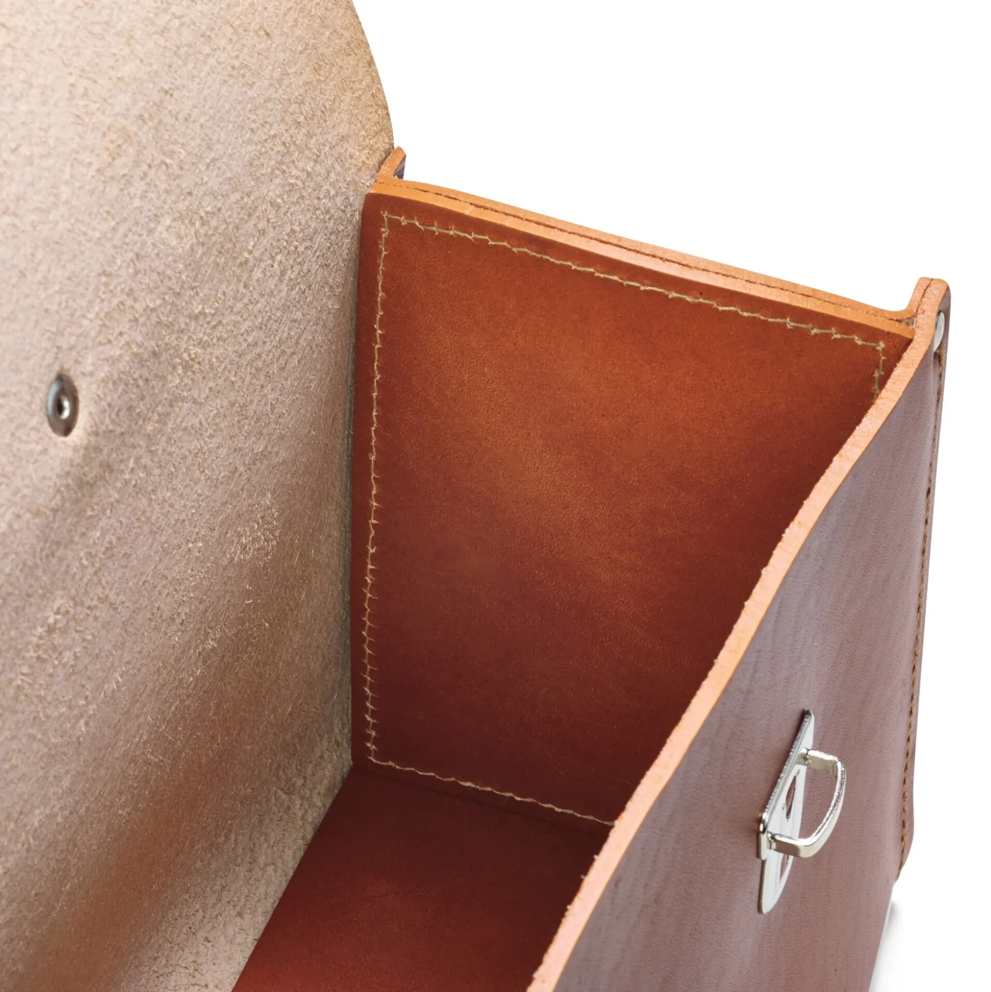 Wasserbüffelleder, pflanzlich gegerbt, vernäht und genietet, an den Innenseiten und am Boden gedoppelt. Ledergriff. Beschläge und Nieten Eisen vernickelt.